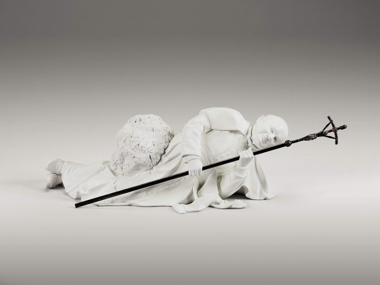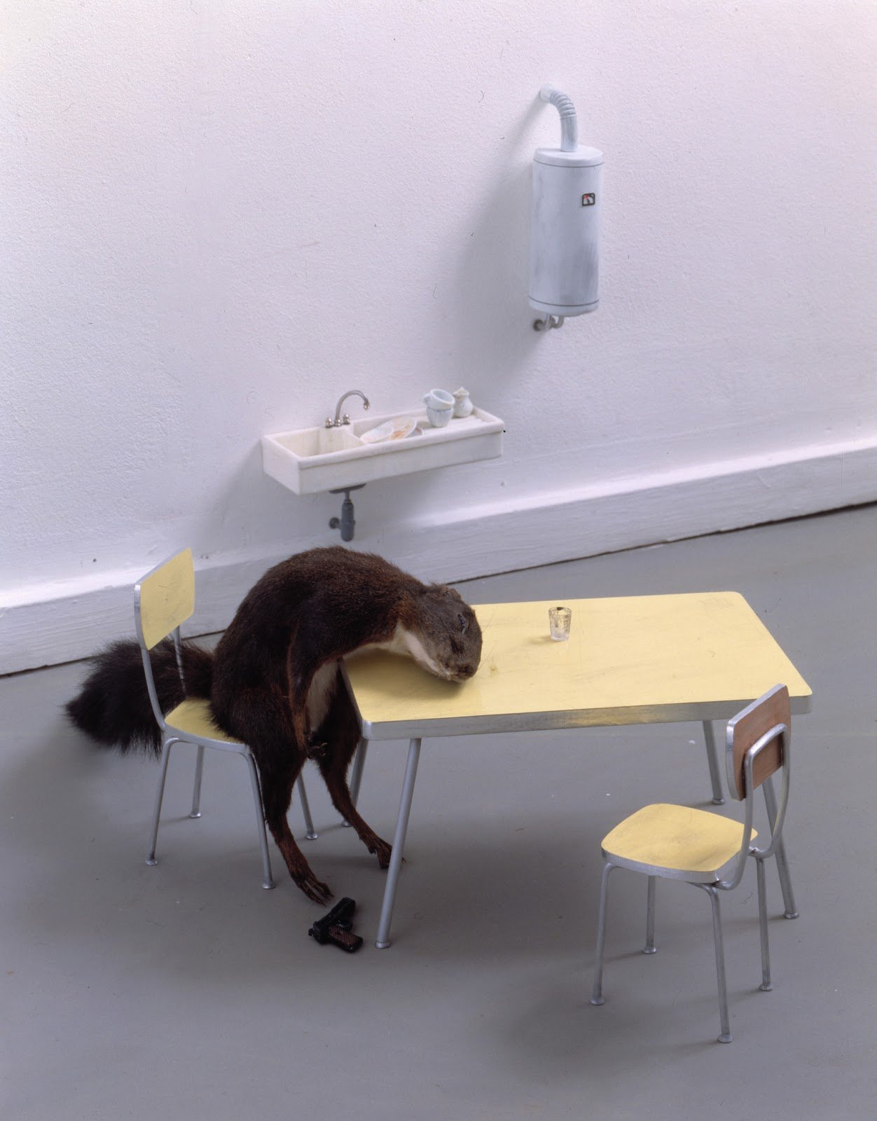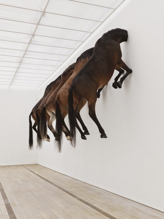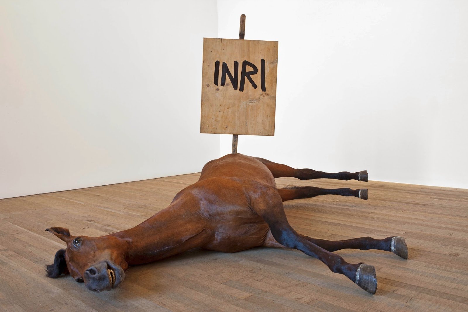 La transformación de desechos en arte de alto nivel y no menos elevado precio aparece también en la escultura sin título de una escoba apoyada en un lienzo en blanco al que sostiene en equilibrio para que no se caiga de la pared de la galería, el perro durmiente taxidermizado (hay varios, uno de ellos titulado Barato de alimentar) y la vaca con manetas de ciclomotor en vez de cuernos… Hay, como se ve, un cierto humor procedente de los ready made de Duchamp, una o pizca de arte povera y un profundo cuestionamiento sobre a qué llamamos arte hoy.