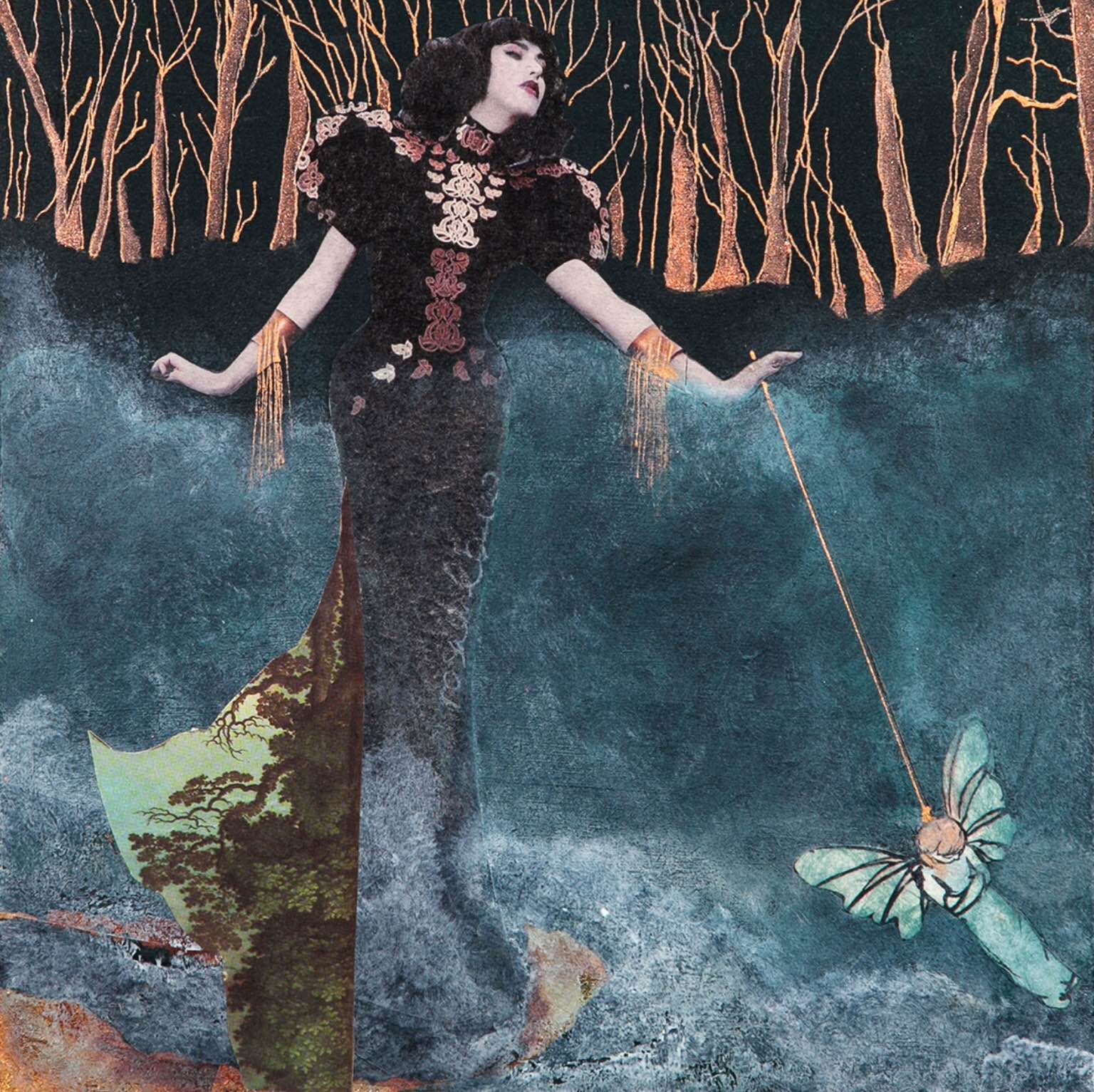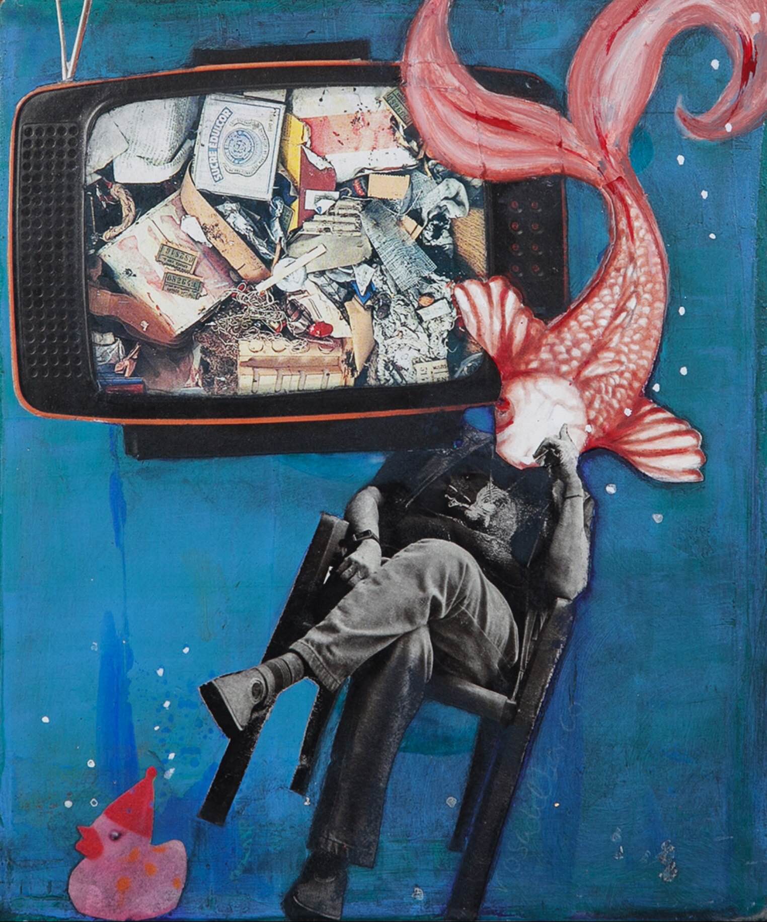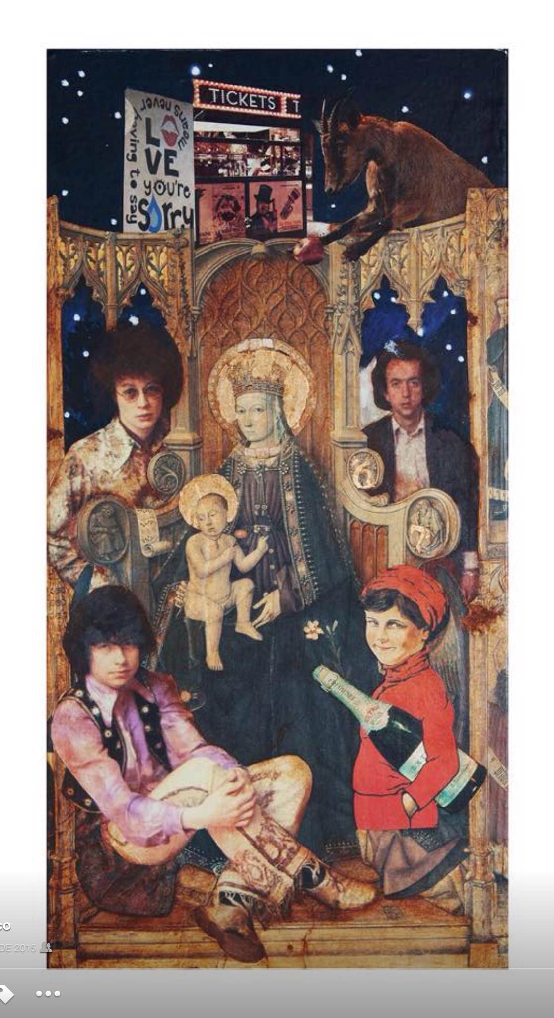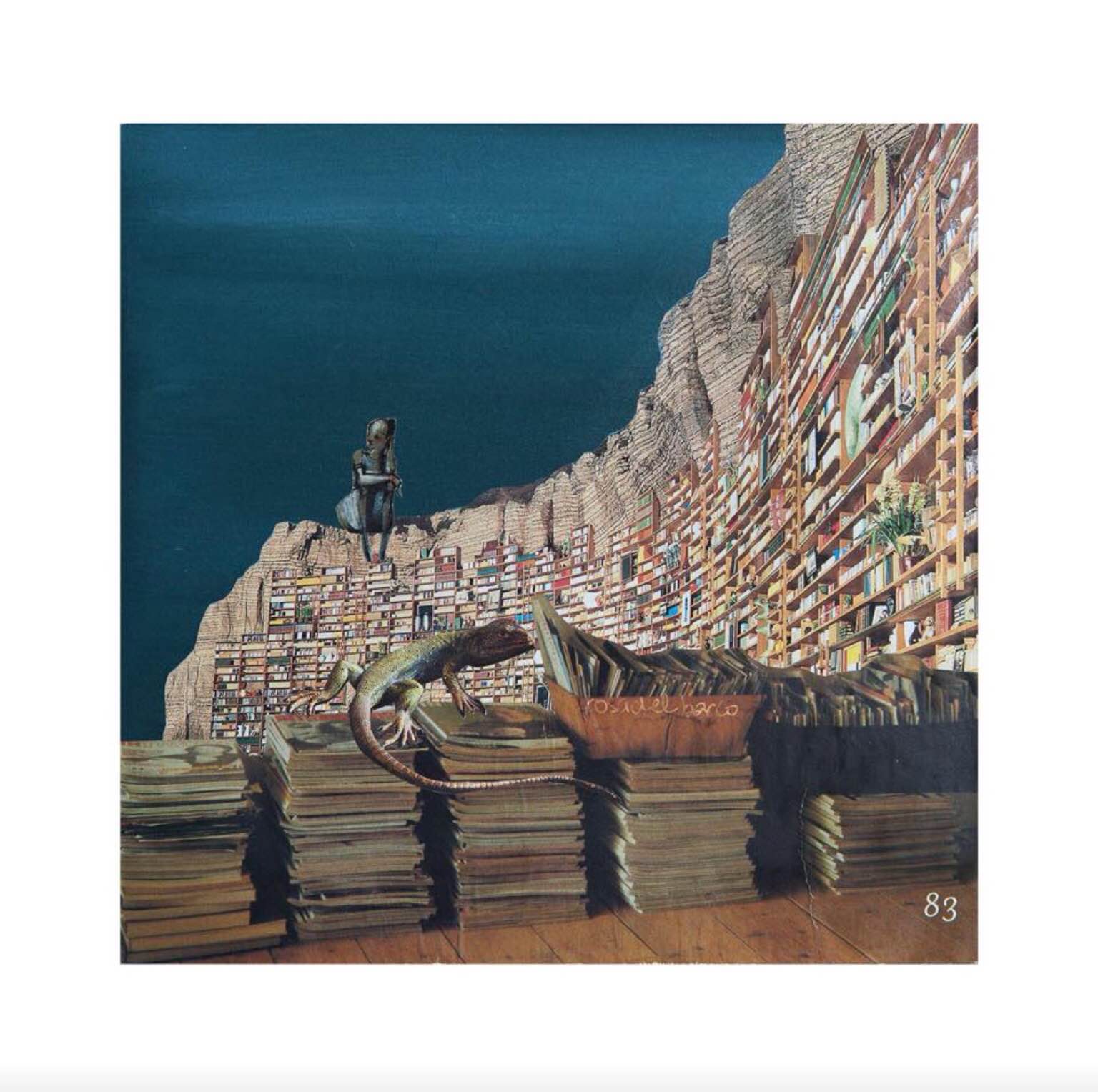 En sus collages encontramos una técnica depurada en juegos de superposiciones precisas entre animales, motivos religiosos y personajes vintage que se mezclan para crear nuevas formas donde la geometría y los colores, planos y brillantes, llenan cada pieza.