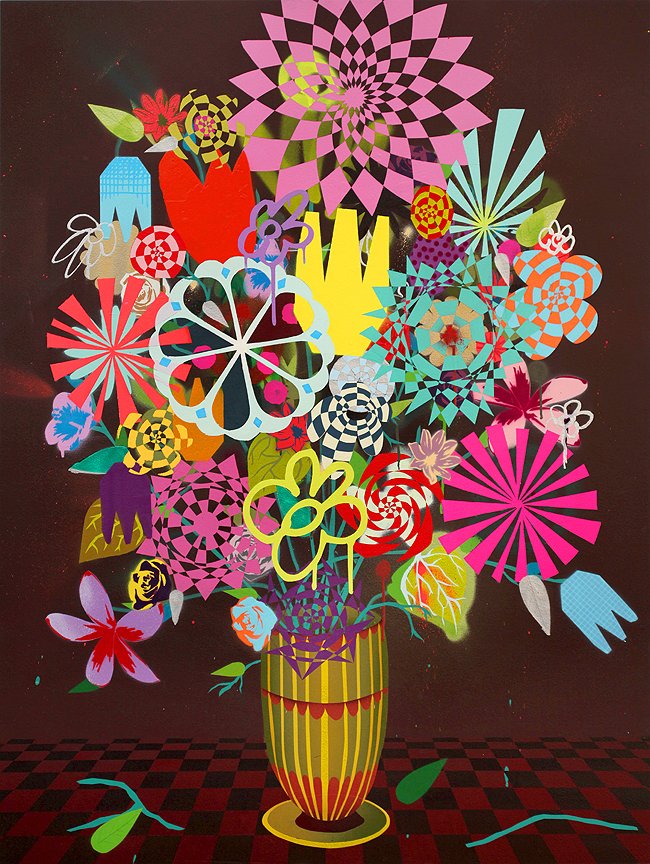 Pero el pintor no se queda ahí, es capaz de recrear con igual maestría modernos bodegones, lienzos que recuerdan expresivos collages, graffitis o carteles gráficos. Eso si, siempre llenos de color y psicodelia, optimista y pasional sus lisérgicas composiciones te empujan a buscar el detalle si quieres descubrir todo cuanto tienes delante.