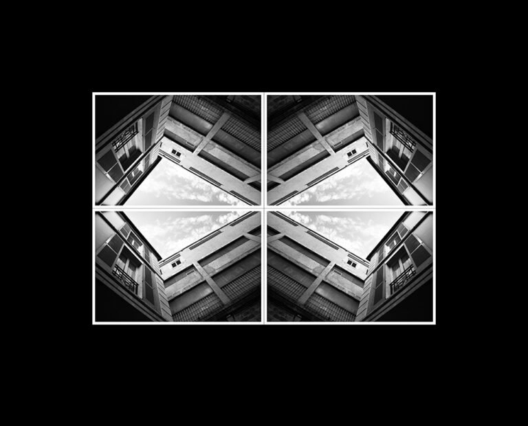 Cada fachada, cada elemento constructivo u ornamental, despliega su singularidad en escenarios modelados por la suma aleatoria de pensamientos, gustos y voluntades. Formalmente, ha versionado/reinterpretado estos escenarios desde un punto de vista geométrico de multiplicidad. Un espejismo en el que convergen reflejos de vidas pasadas y presencias que han ido emergiendo poco a poco, y desde su silencio, nos hablan del paso del tiempo, de los cambios.