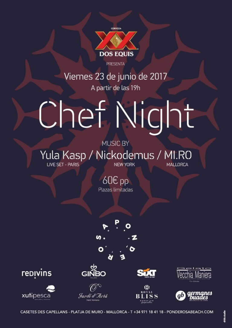 Las “chef nights” son eventos que Ponderosa Beach crea cada año tanto en su restaurante como en otros lugares. Invitan a chefs nacionales e internacionales de reconocido prestigio para que creen un menú especial y aporten su creatividad y sabiduría. Además de los eventos que hacen en su casa la «Chef Night» también se exporta a otros lugares. El equipo de cocina del Ponderosa se traslada donde sea para ofrecer las delicias de su cocina allá donde se quieran.