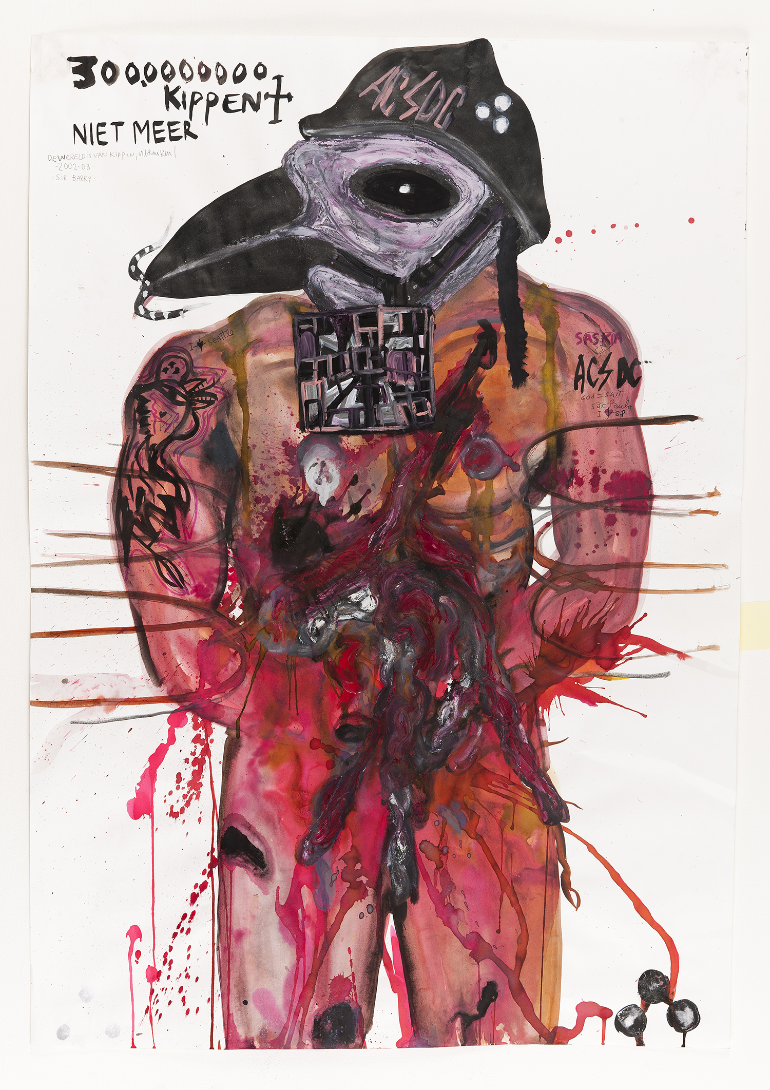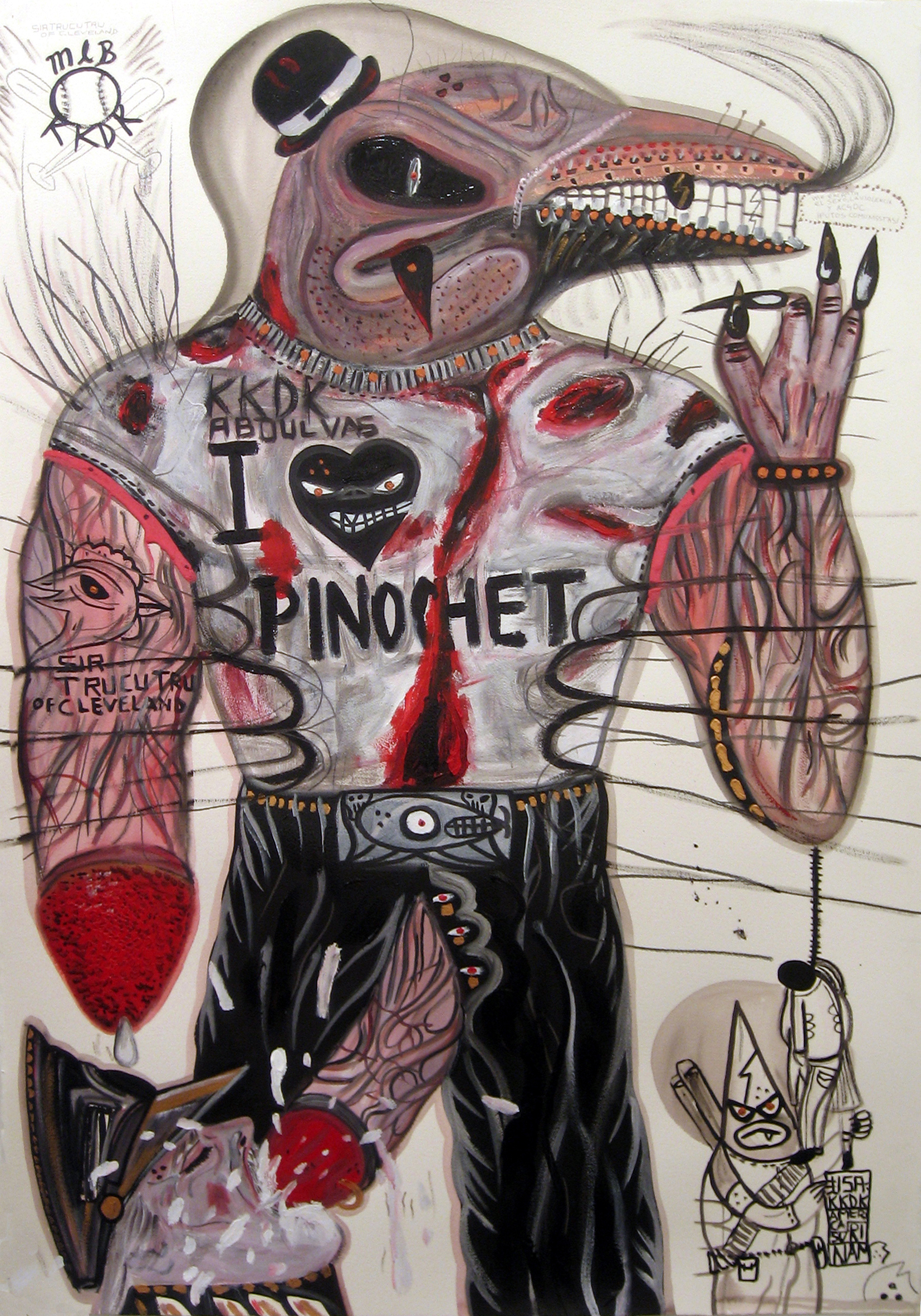 Abdul Vas, utiliza un rico código infraccionario para una ficción. Sus pinturas, dibujos y otras producciones pictóricas sobre diversos soportes, hablan de una ficticia inversión de nuestro genocidio alimentario. El pollo, objeto de una inversión de sentido, se representa como exterminador y fan de AC/DC, lo que hace imposible observarlo en ese proceso como comida, su destino en la realidad. El delirio de sus pinturas va dirigido a corregir la infantilización del animal en los códigos de representación de la industria del alimento y de la cultura, pero también a nombrar las evidencias del campo de concentración humano.