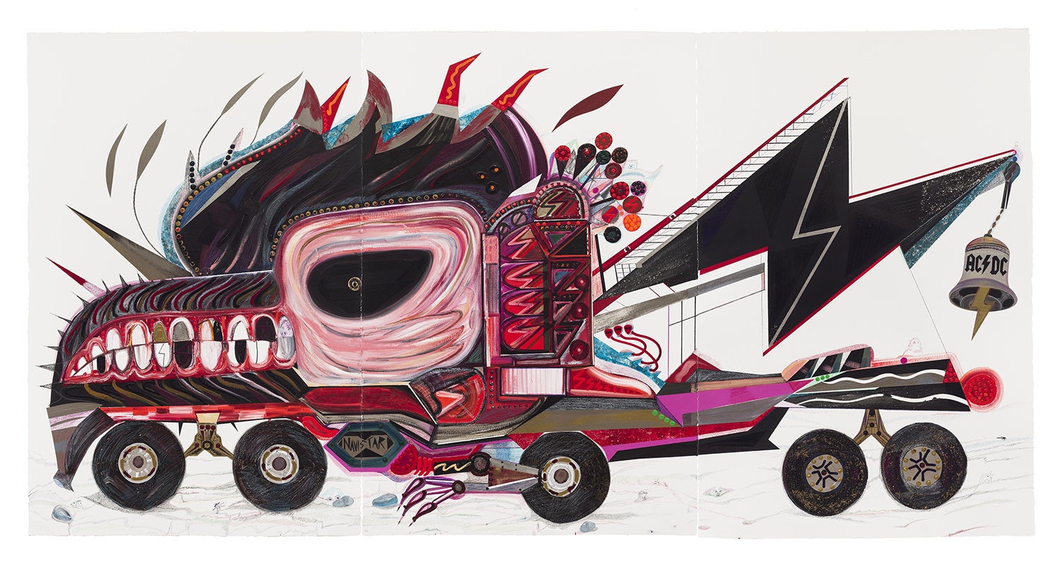 oil, ink, pencil and senok on paper, 60.2 x 122 in / 153 x 310 cm