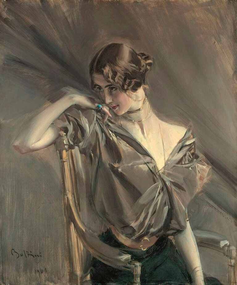 Nacido en Ferrara en 1842, el pintor Giovanni Boldini se convirtió en uno de los más importantes retratistas italianos en el cambio de siglo. Instalado en París desde 1871, fue conocido como uno de los primeros pintores de Montmartre, aquel barrio que pronto sería espacio de encuentro de gran parte de la bohemia nacional e internacional. Influido a su llegada a la capital francesa por la obra de Meissioner y Fortuny, a quien no llegaría a conocer personalmente debido a la prematura muerte del español, Boldini mantuvo un estilo único a lo largo de toda su vida, basado en la intuición del instante y el movimiento, reflejado con rápidas pinceladas, pero sin perder nunca de vista la figura y la expresión del retratado.
