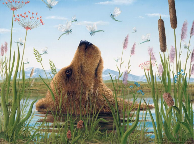 El oso a menudo se asocia con los sueños. Debido a que duerme durante una parte importante del año, el oso siempre está soñando con el mundo. Hibernación es la palabra que se usa en relación con los osos, pero los osos en realidad no hibernan porque no producen la química para detener o ralentizar sus cuerpos. Más bien sueñan. Pero yendo más allá, el oso busca medicamentos y aconseja a los ancestros que encuentren las raíces que pueden sanar. En realidad, el oso es un animal muy peligroso y no un amigo del hombre. Más bien, los ancestros vieron que el peligro del oso era el mejor maestro sobre el poder. Por lo tanto, la imagen icónica del oso me ha perseguido y continúa intrigándome a lo largo del tiempo «.