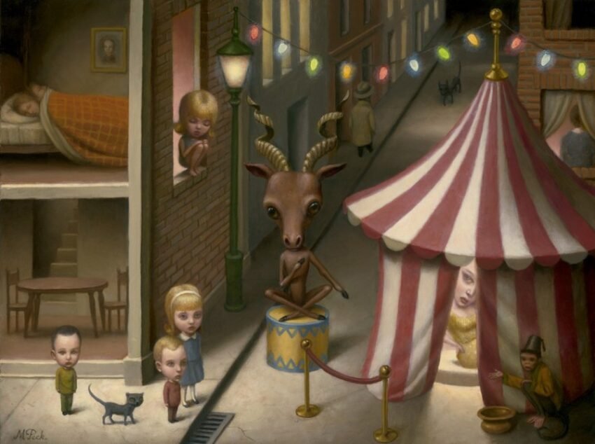 Surrealista en su estilo de pintura de las criaturas de tiempos modernos, el trabajo de Marion Peck es sin embargo emocionalmente realista.