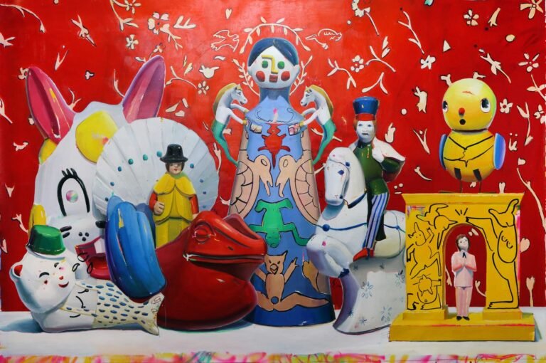 Esta idea se puede encontrar en tres áreas: 1) en los elementos representados: la mayoría son piezas infantiles, objetos decorativos u objetos de uso cotidiano. 2) en la forma en que trabaja y da forma a dichos elementos: pinta, rompe, desfigura, ensambla o combina de alguna manera, como si estuviera jugando con ellos. Y 3) en la forma en que aborda una pieza: prueba, borra, vuelve a pintar, la modifica e incluso la cubre con spray como si destrozara su propia obra.