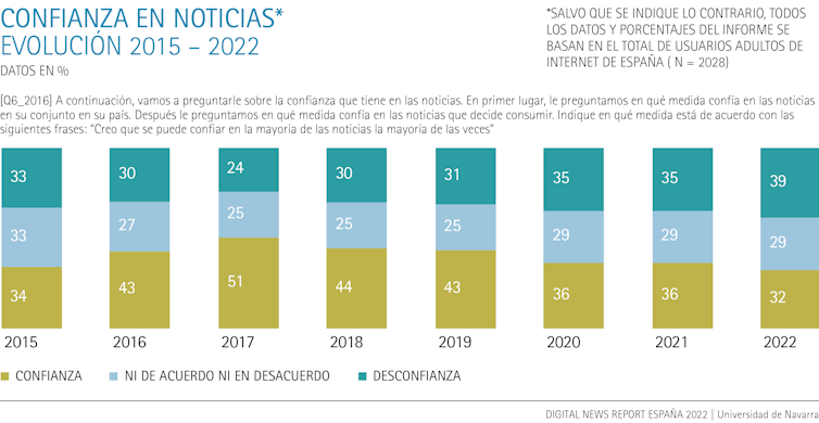 Las conclusiones sobre los medios del Eurobarómetro de la Comisión Europea (2022) publicadas en abril reflejan un “malestar de fondo”. El grado de confianza en los medios de los españoles es menor al del resto de los europeos. En todos los medios el saldo es negativo: el número de quienes desconfían supera al de los que confían.