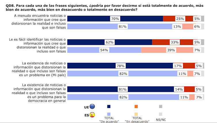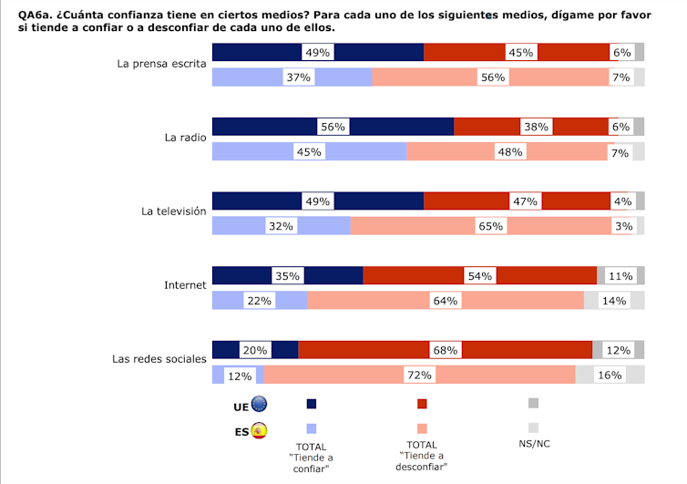 El medio con mayor índice de confianza es la radio, con un porcentaje del 45 %. En los diarios la cifra se sitúa en el 37 %; en televisión la cifra es del 32 %; en internet no supera el 22 %. Cierran la lista las redes sociales (12 %). Los españoles confían menos que los demás europeos en todos los medios: 17 puntos menos en la televisión; 12 puntos menos en los diarios; 9 puntos menos en la radio; 13 puntos menos en internet y ocho puntos menos en las redes sociales. El 81 % de la población española y el 70 % de la europea consideran que las noticias están a menudo distorsionadas o son, directamente, falsas.