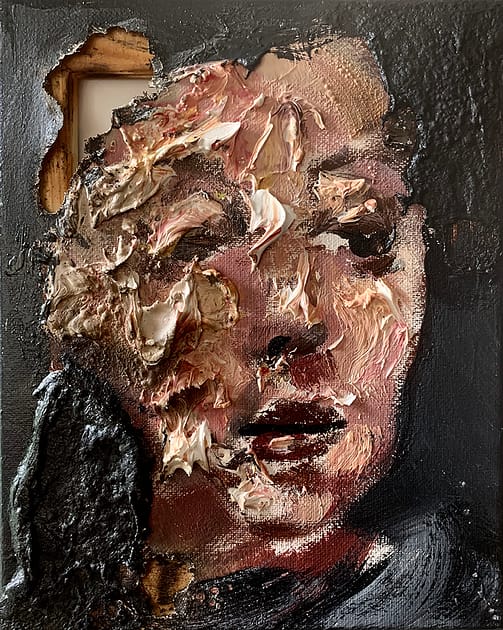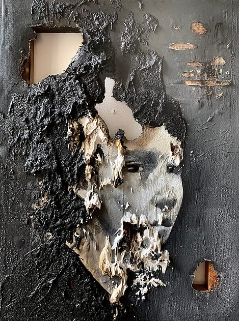 Abrazando el concepto de desintegración, sus lienzos están marcados con rasgaduras y laceraciones, exponiendo los bastidores y distorsionando aspectos del retrato para hacer eco de las obras dañadas de la colección del Vaticano.