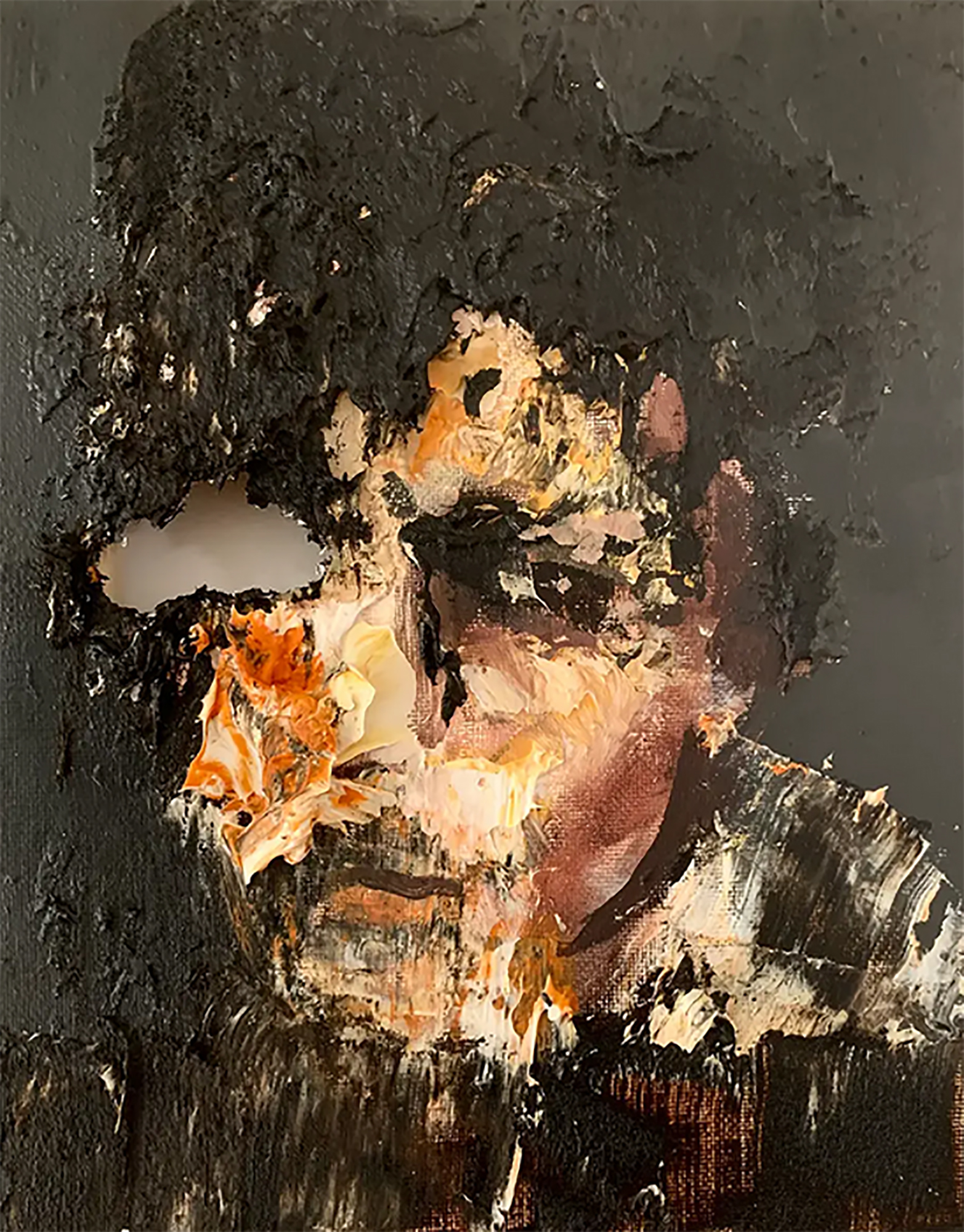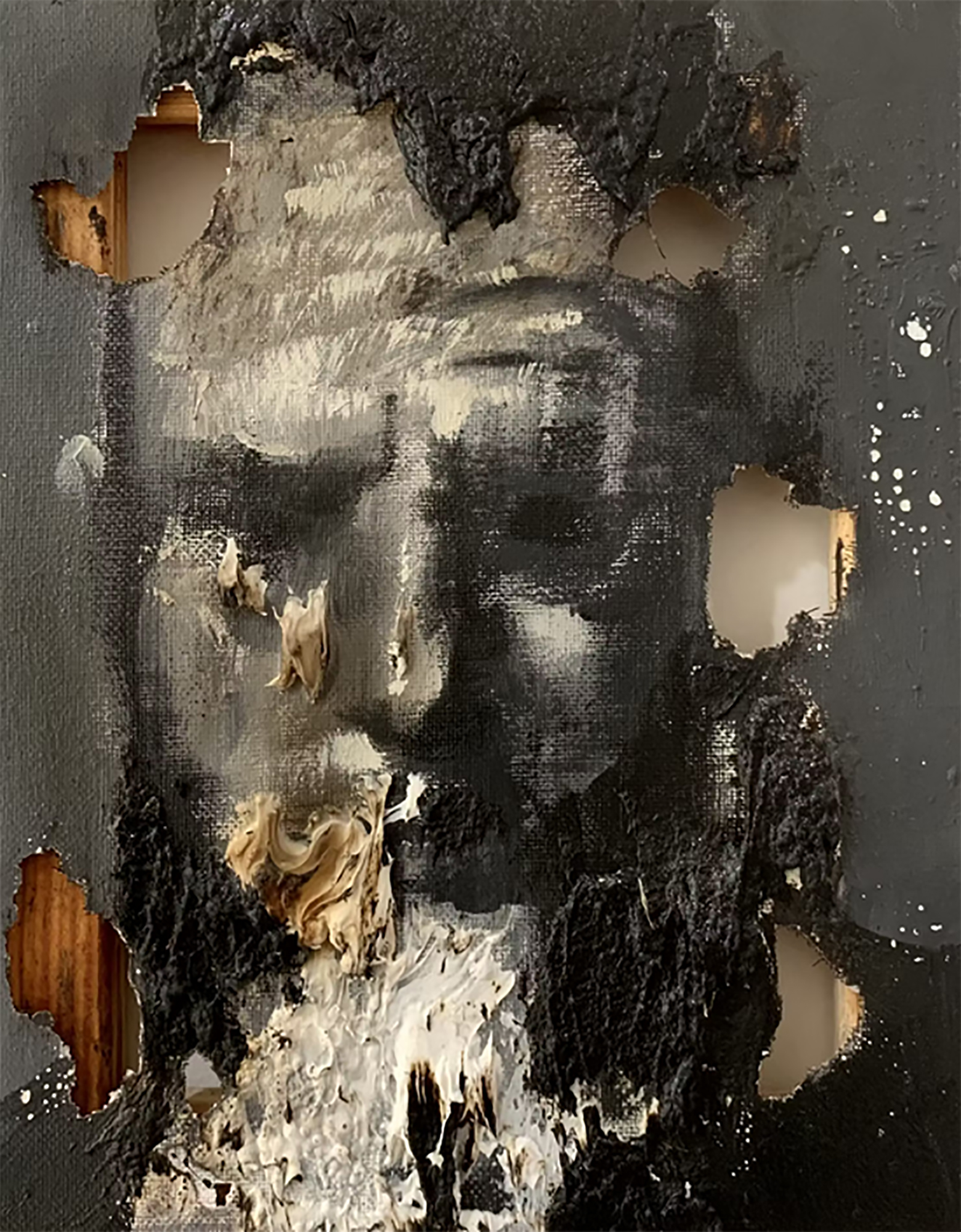 Abrazando el concepto de desintegración, sus lienzos están marcados con rasgaduras y laceraciones, exponiendo los bastidores y distorsionando aspectos del retrato para hacer eco de las obras dañadas de la colección del Vaticano.
