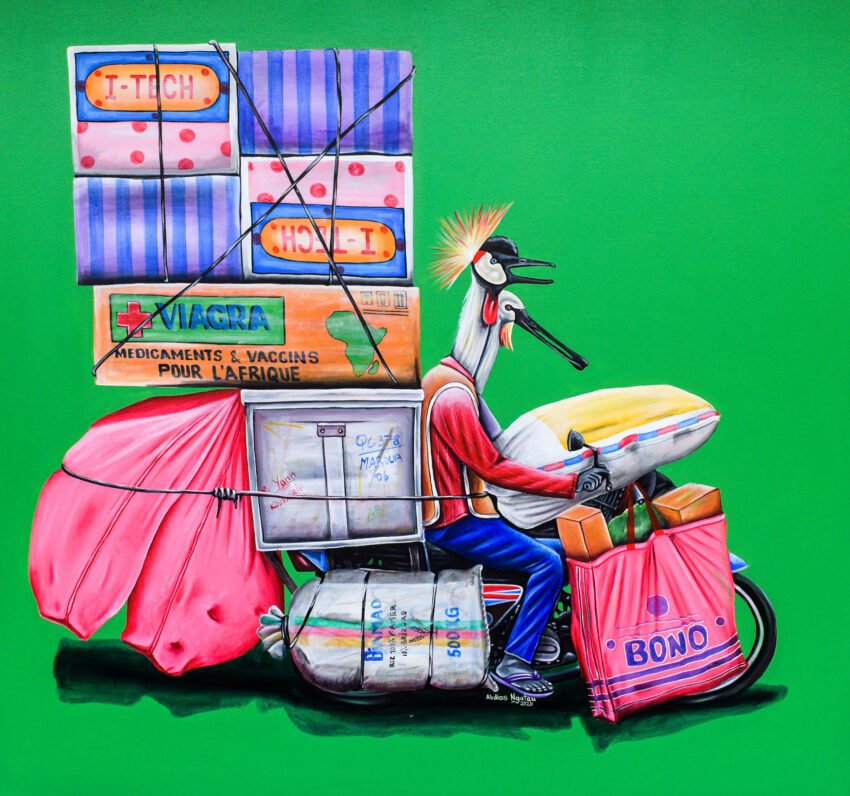 Sus coloridas obras son indiscutiblemente divertidas, pero al mismo tiempo son un testigo distanciado de la sociología camerunesa, que podría ser igualmente la de cualquiera de los países africanos. La sátira se cuela hasta en las marcas y los signos distintivos de las mercancías transportadas, las inscripciones pintadas en contrastantes colores en forma de patchwork sobre las carrocerías de los vehículos: “wifi gratuit à bord”, “taxi climatisé”, o algo más patético, como “La vie de l’homme noir”.