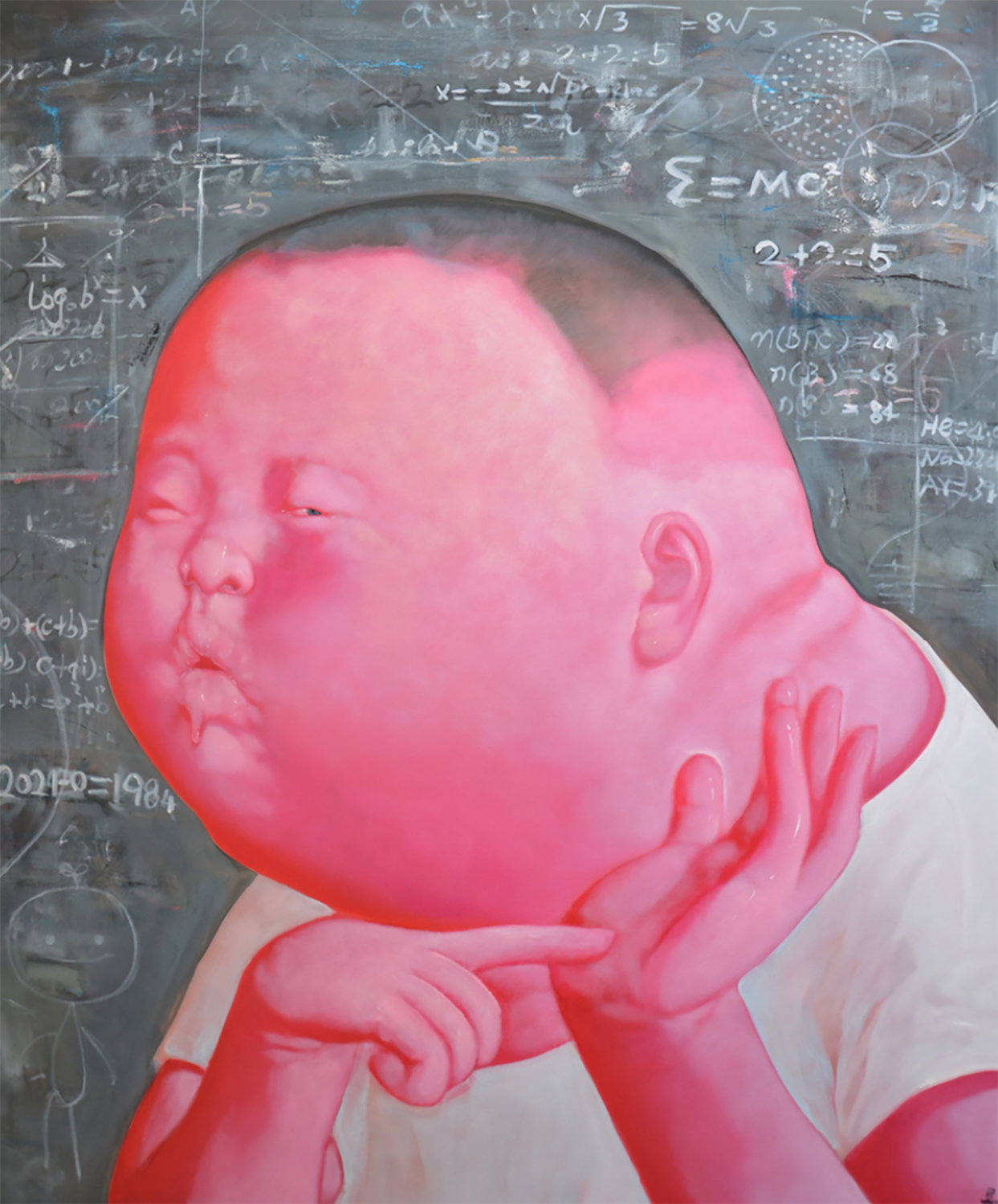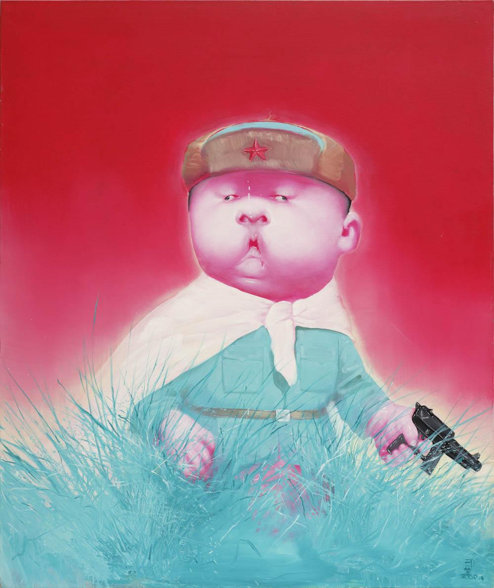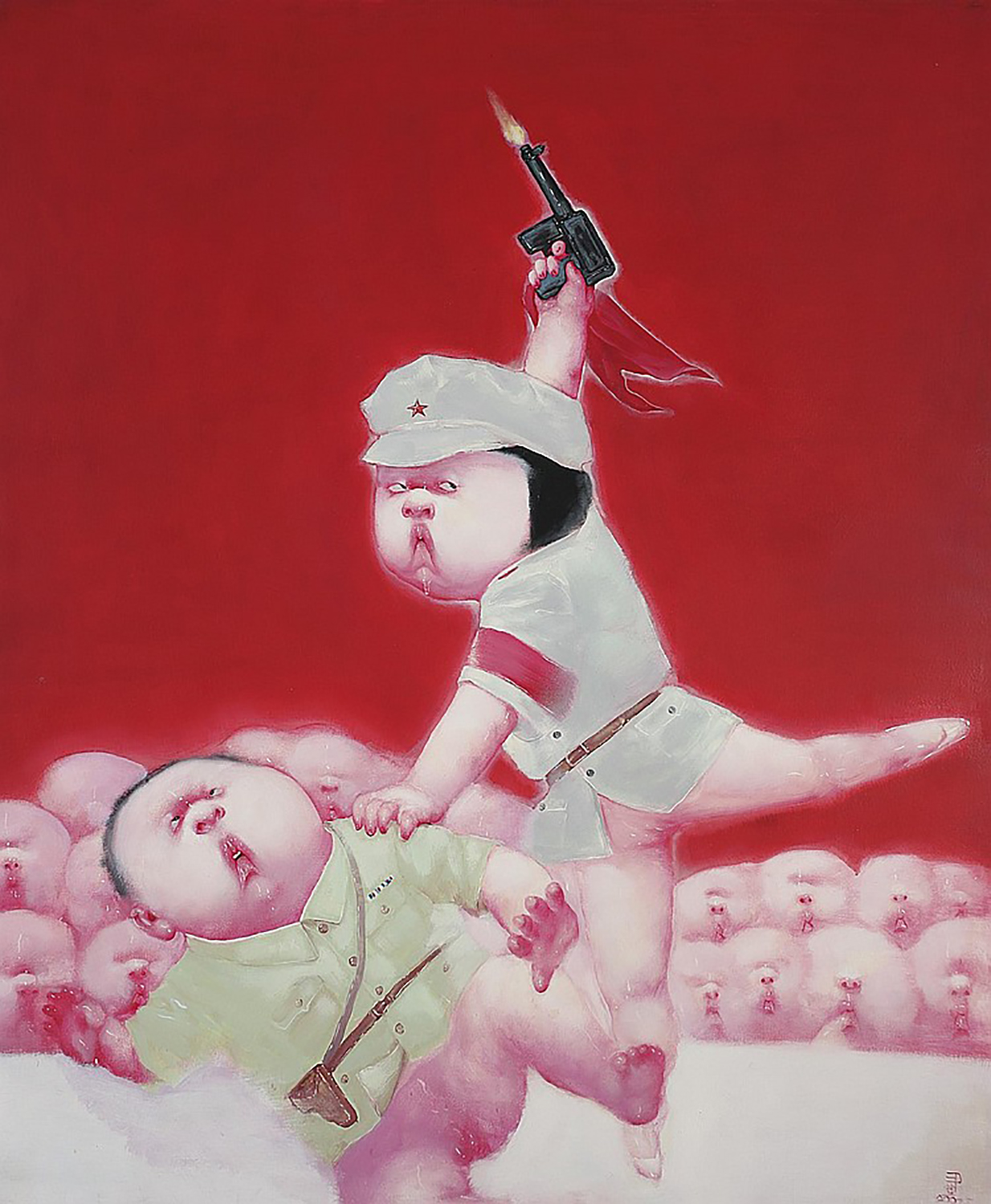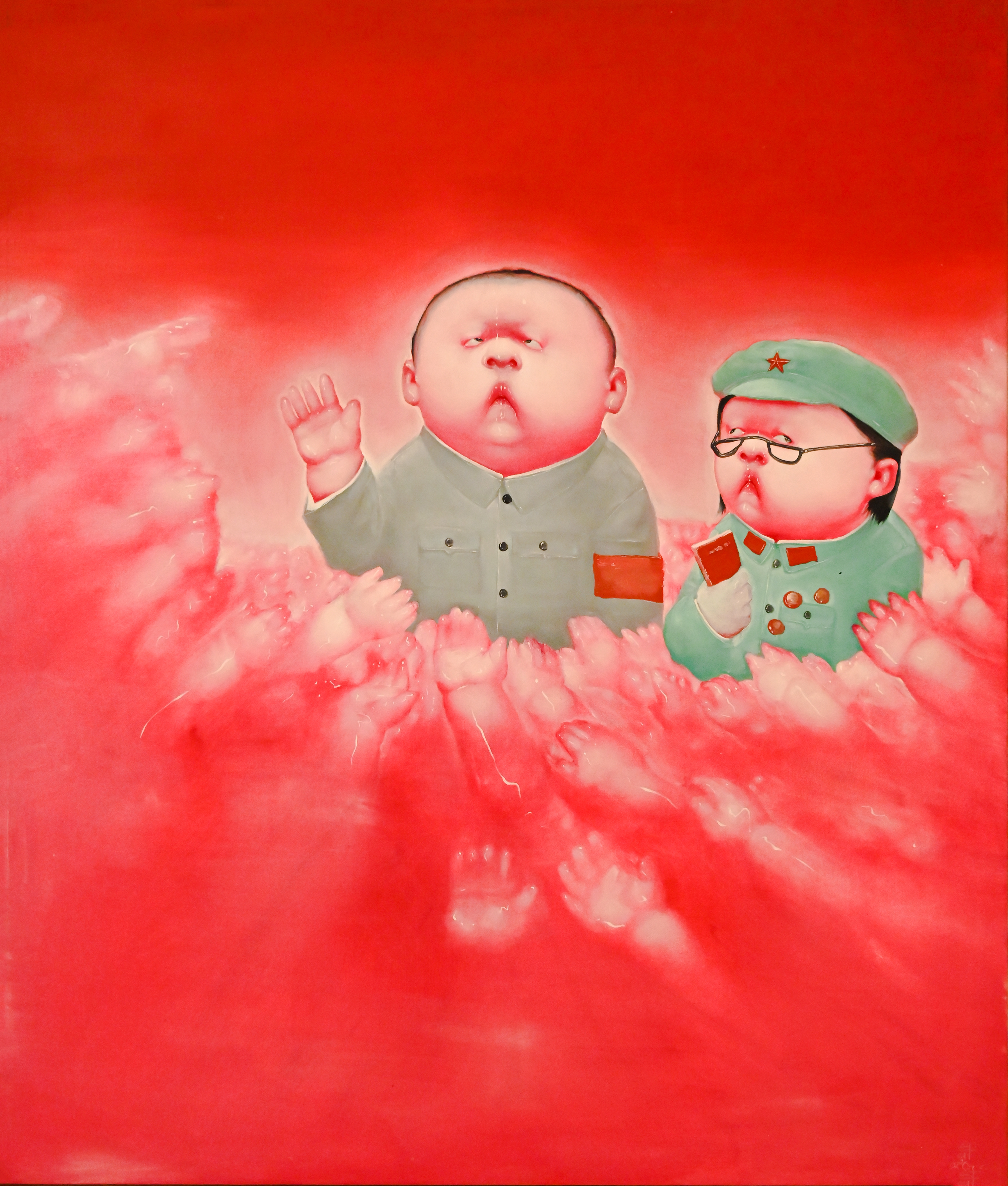 Yin Kun y la historia de China. Sus pinturas son vibrantes y coloridas, estilo pop-art. Pinta los rostros de niños, bebés, oficiales militares y Mao Zedong, todos con desarmantes mejillas de color rosa.