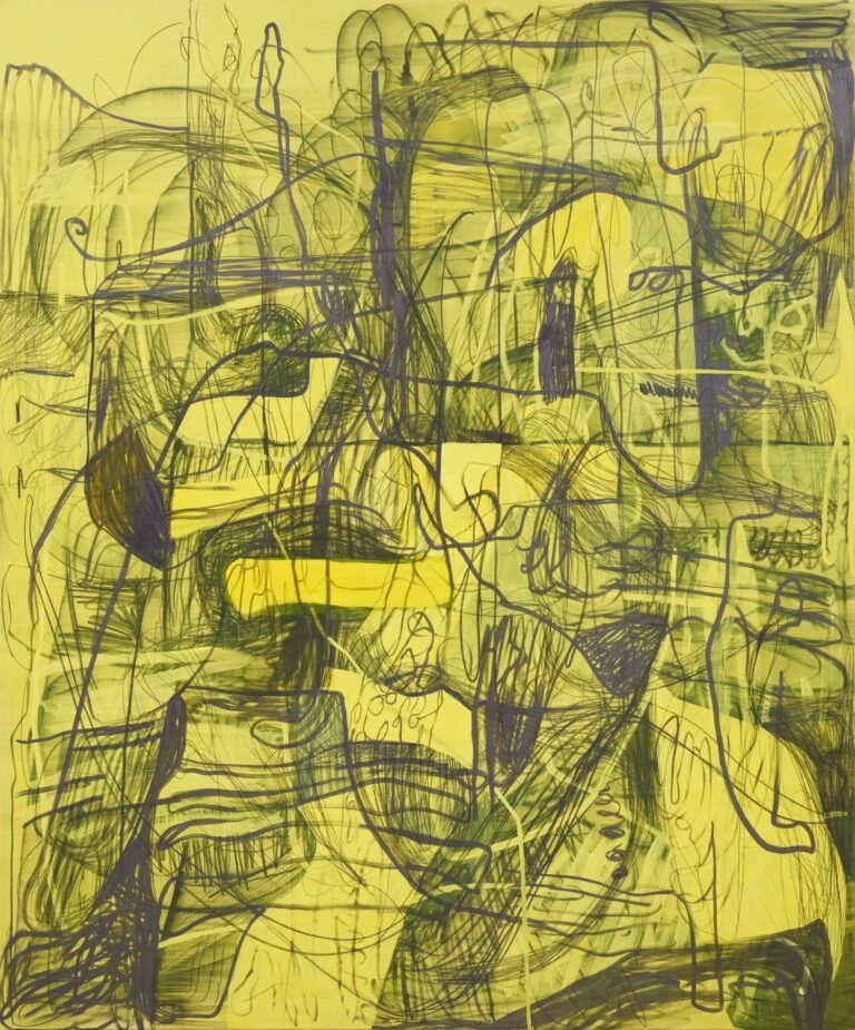 Además, un elemento ambiguo permanece: el fondo de la pintura, aunque pintado de manera más rápida y gestual, se desdibuja y se convierte en un eco del protagonista dominante de la obra, es decir, la línea final, completada lentamente y con conciencia en pintura al óleo. La forma casual y al pasar en que los garabatos aparecen en el lienzo no solo es contemporánea en su estilo visual, sino que también sugiere una superposición energética de diferentes niveles de significado. Esta cualidad única nos dirige hacia cuestiones importantes dentro del género de la pintura contemporánea.