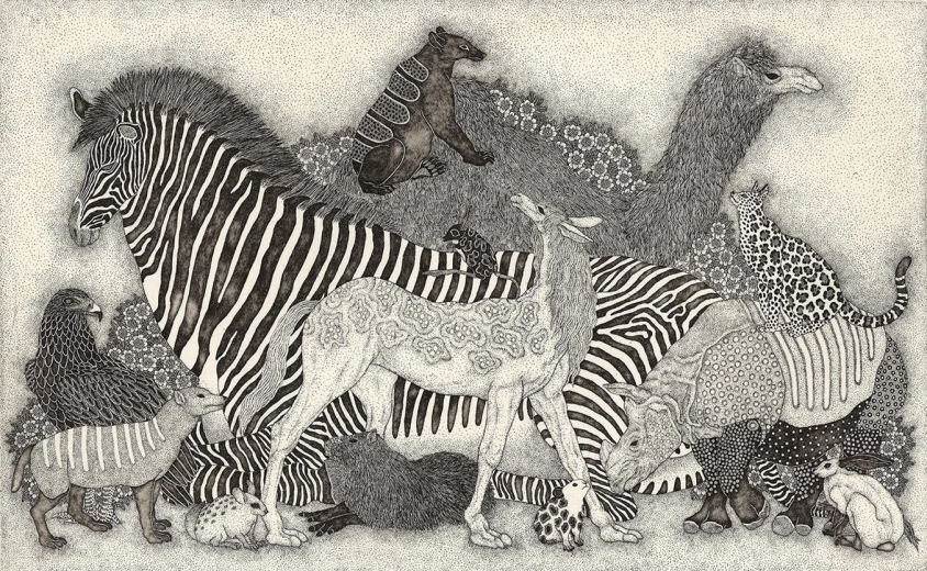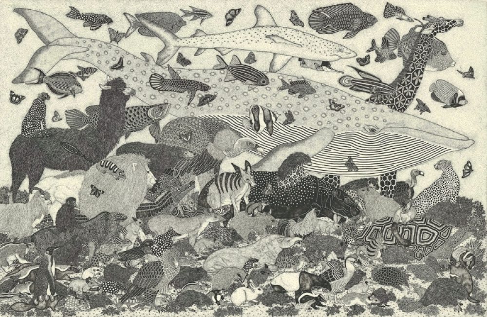 Un mundo sin fronteras por Etsuko Fukaya. Las representaciones de Fukaya incluyen no solo plantas y animales que existen o han existido, sino también criaturas imaginarias, como seres humanos combinados con animales y plantas, y criaturas que no existen en la Tierra.