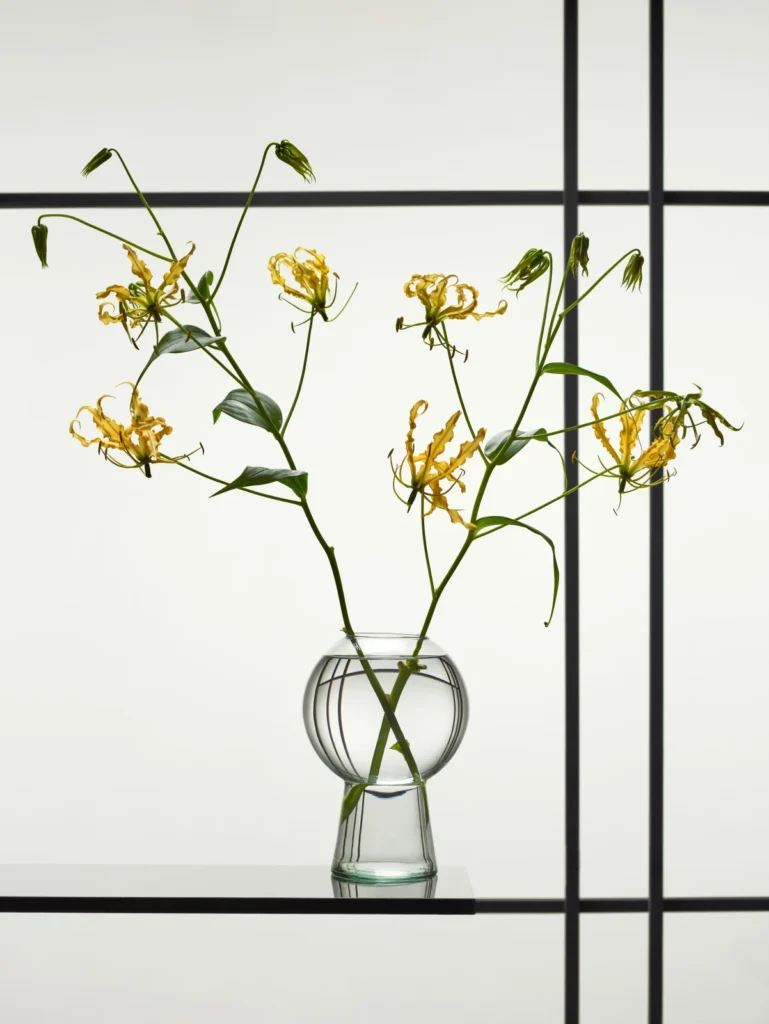 Las flores, suspendidas en un espacio cuidadosamente diseñado, actúan como metáforas de la fragilidad y la transitoriedad de la vida.