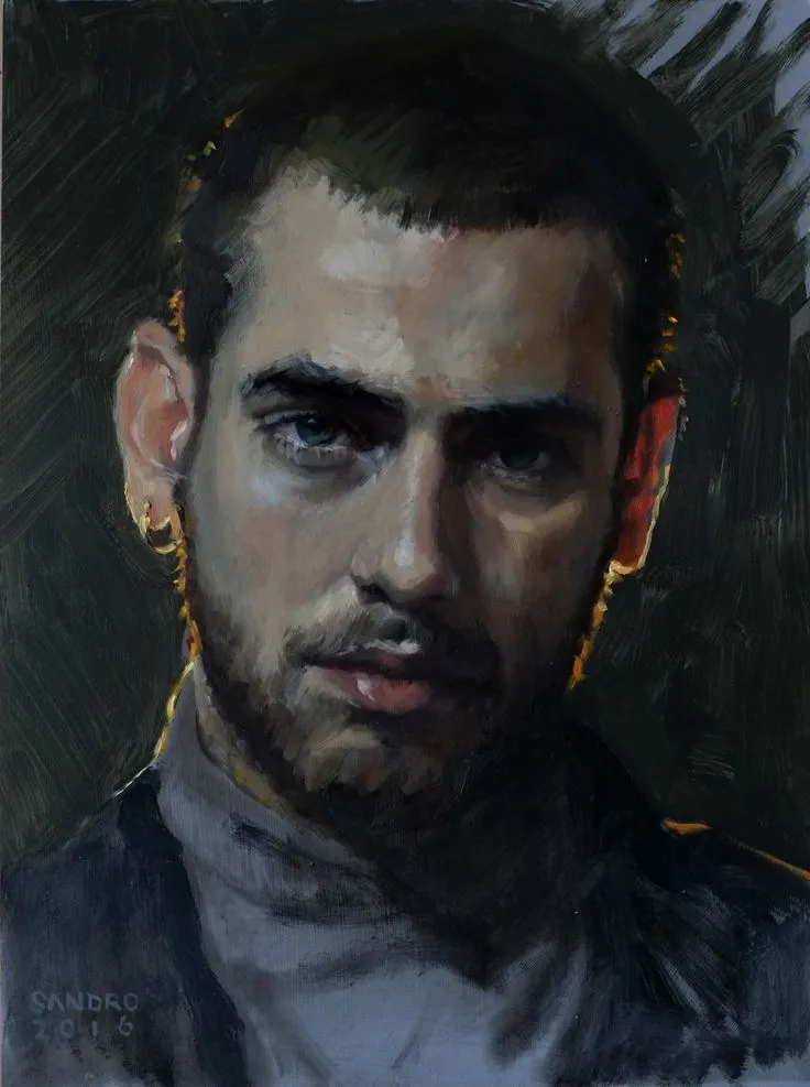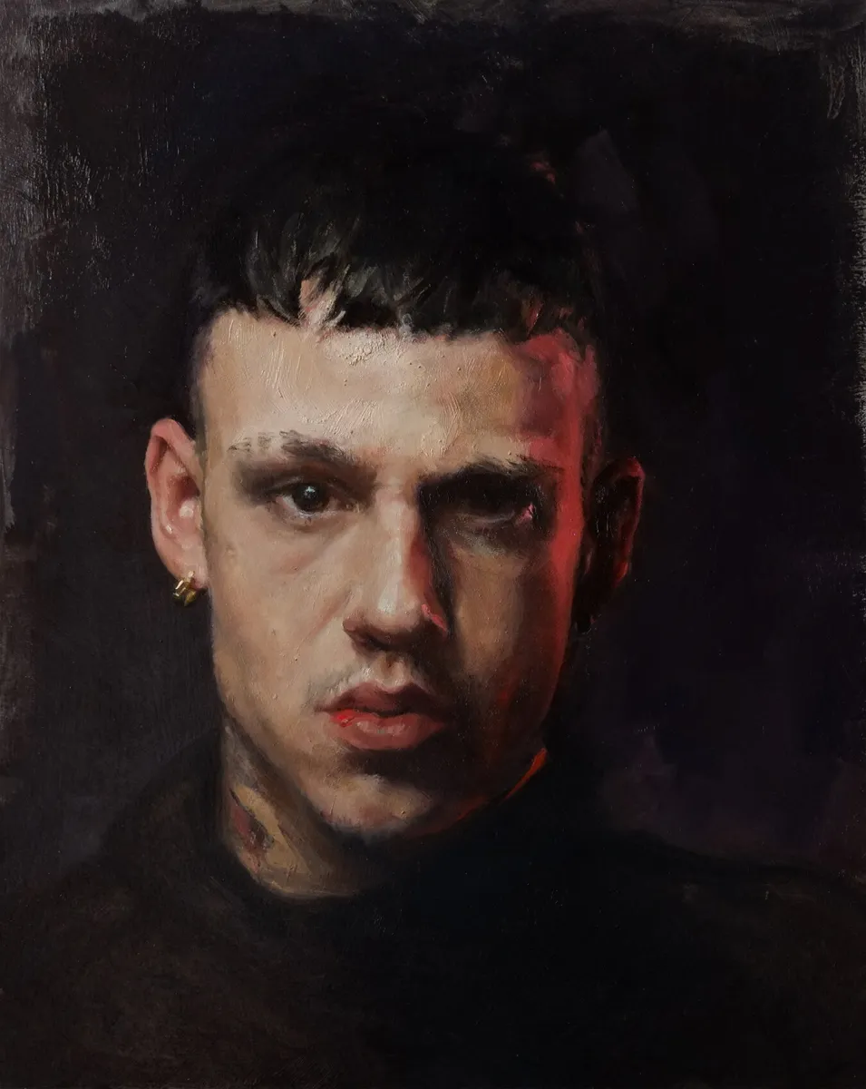 Obras como “To The Birds” (2019, óleo sobre aluminio) muestran claramente el estilo: figura masculina retratada con luz y composición evocadoras de los maestros antiguos, pero ambiente contemporáneo.
