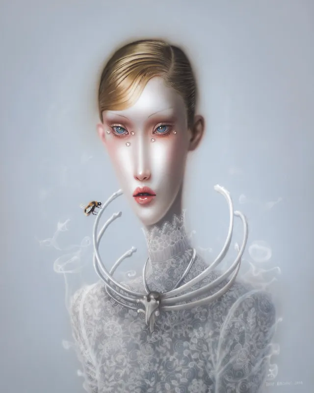 Brooks aprendió a dibujar del cine, y del cine heredó su sentido del drama, su iluminación teatral y su obsesión por la femme fatale. Pero sus damas no fuman cigarrillos en bares llenos de humo ni esperan detectives en puertas entreabiertas. Ellas son el humo y la puerta: figuras etéreas que encarnan la intriga, el deseo y la amenaza al mismo tiempo. En sus lienzos, las mujeres parecen recién salidas de una pesadilla glamorosa, con peinados imposibles, rostros angulosos y una elegancia que roza lo sobrenatural. Son diosas de porcelana atrapadas en el instante justo antes de la catástrofe.
