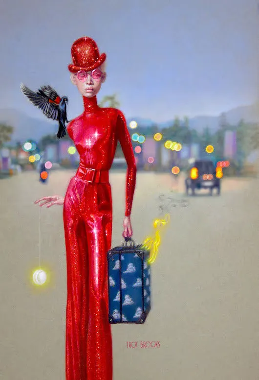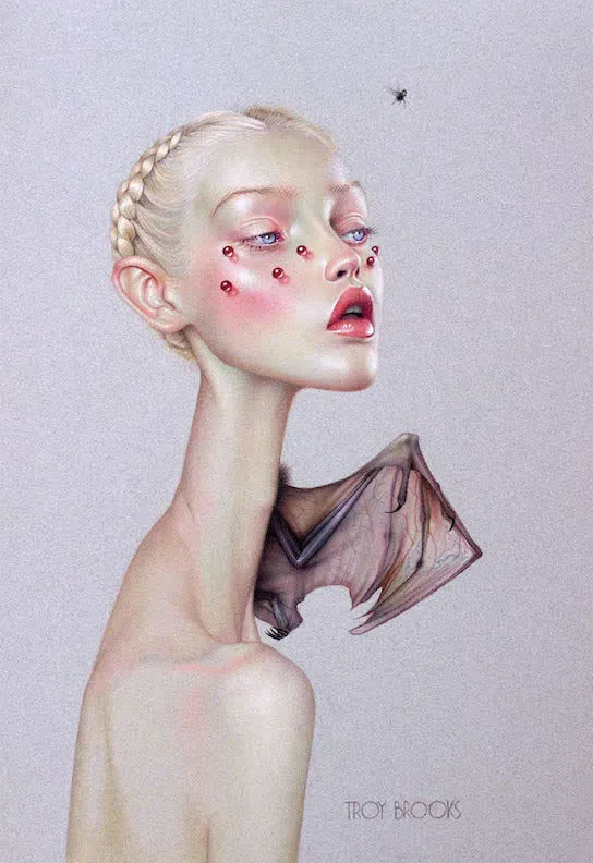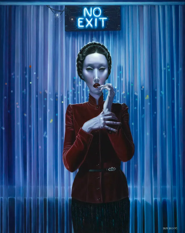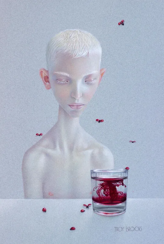 Estéticamente, Brooks bebe del surrealismo, del arte pop y, por supuesto, del cine negro. Pero su toque personal convierte esas influencias en algo nuevo: una especie de glamour inquietante, donde la belleza nunca está exenta de amenaza. Si los cuadros de David Lynch pudieran maquillarse, seguramente se parecerían a los de Troy Brooks. Su mundo es un desfile de sombras con pestañas postizas, una pasarela de emociones reprimidas bajo luces de neón.