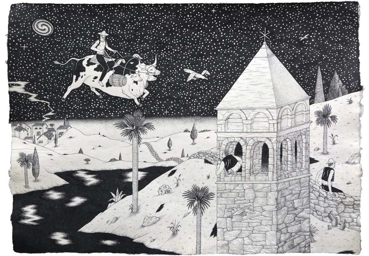 Su práctica es abierta y experimental: lápiz, acuarela, tinta, acrílico, grabado o escultura conviven según lo requiera cada idea. Aprender nuevos lenguajes forma parte del camino.