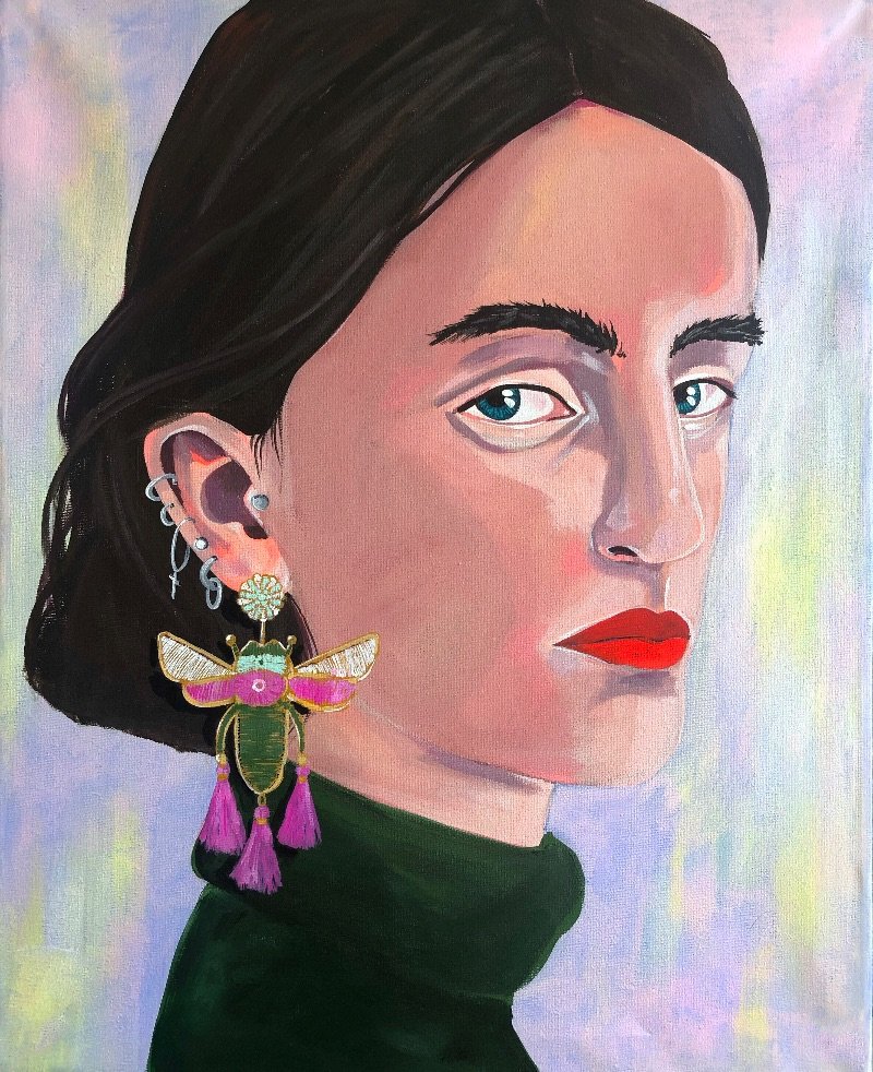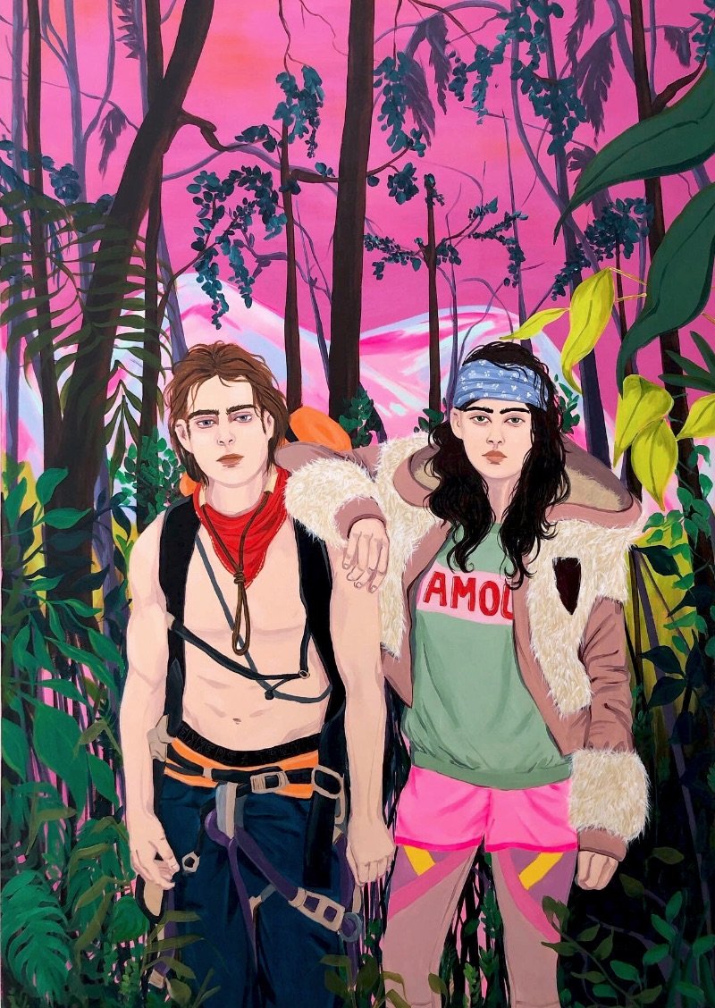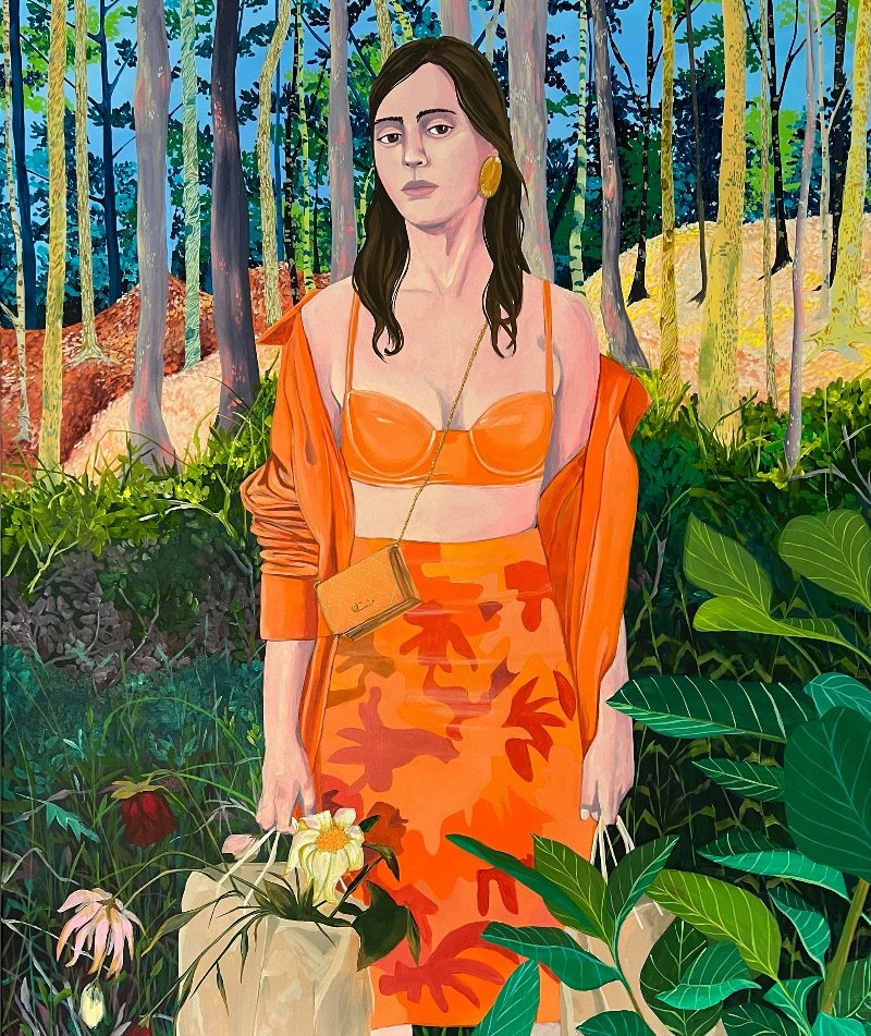 El trasfondo de la moda permanece latente en los tonos vibrantes, en la insistencia de los patrones y en la forma en que el cuerpo se convierte en superficie expresiva. Sin embargo, sus pinturas no son ejercicios decorativos, sino escenarios donde la identidad se negocia, se oculta y se exhibe.