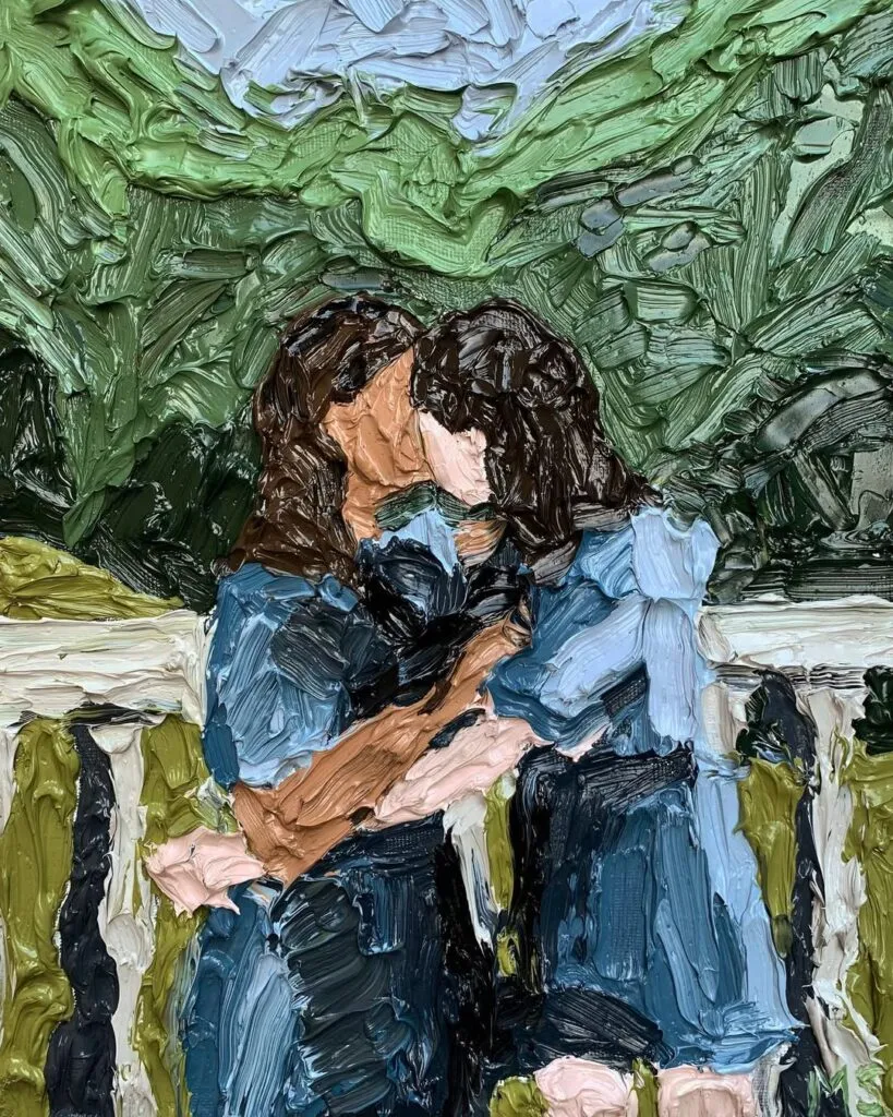 Southwood trabaja con capas de óleo y acrílico que se superponen como si fueran respiraciones. Nada es brusco. Nada es definitivo. Sus paletas empolvadas, desaturadas, envuelven a los personajes y objetos en una luz que parece derretirse. Las formas no aparecen: emergen. Como recuerdos que aún no han decidido si quedarse o desvanecerse.
