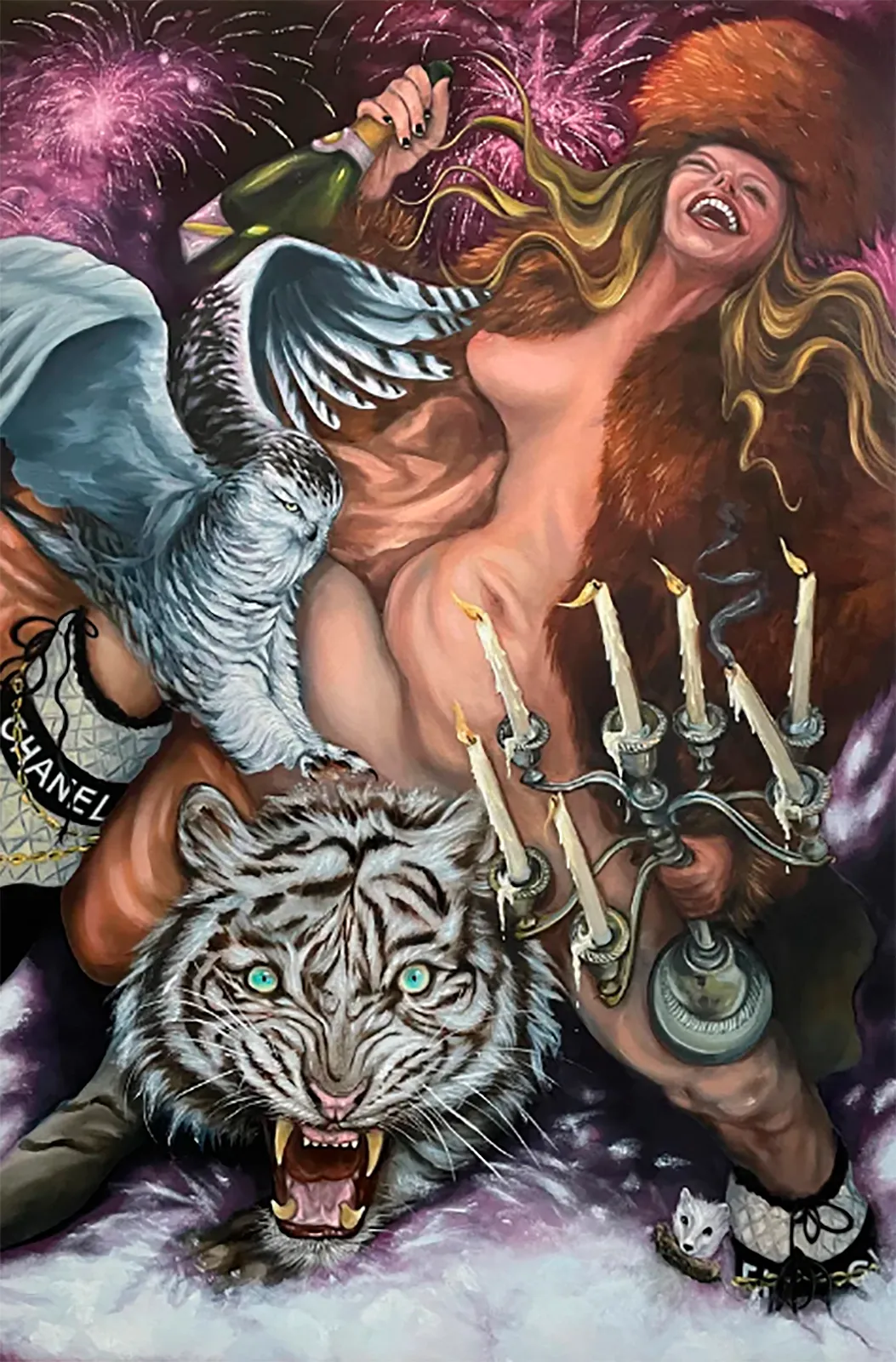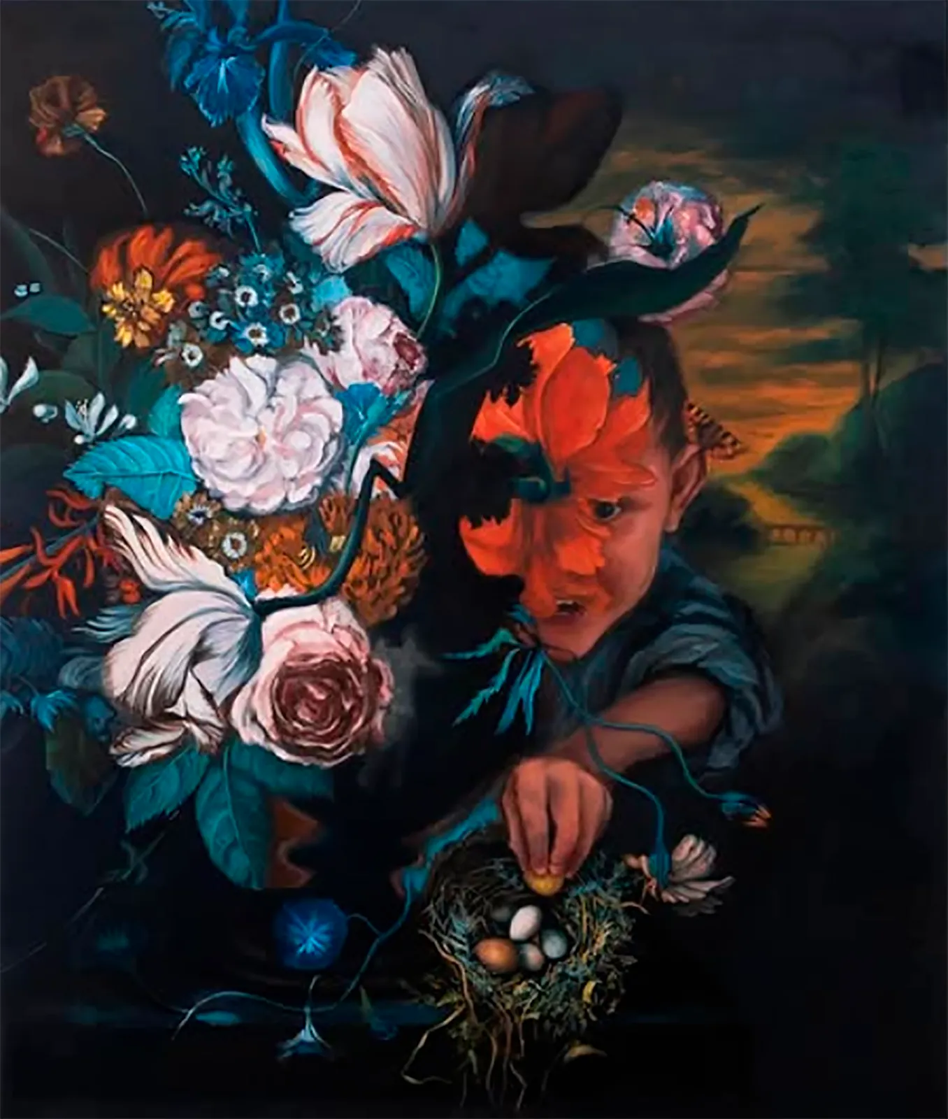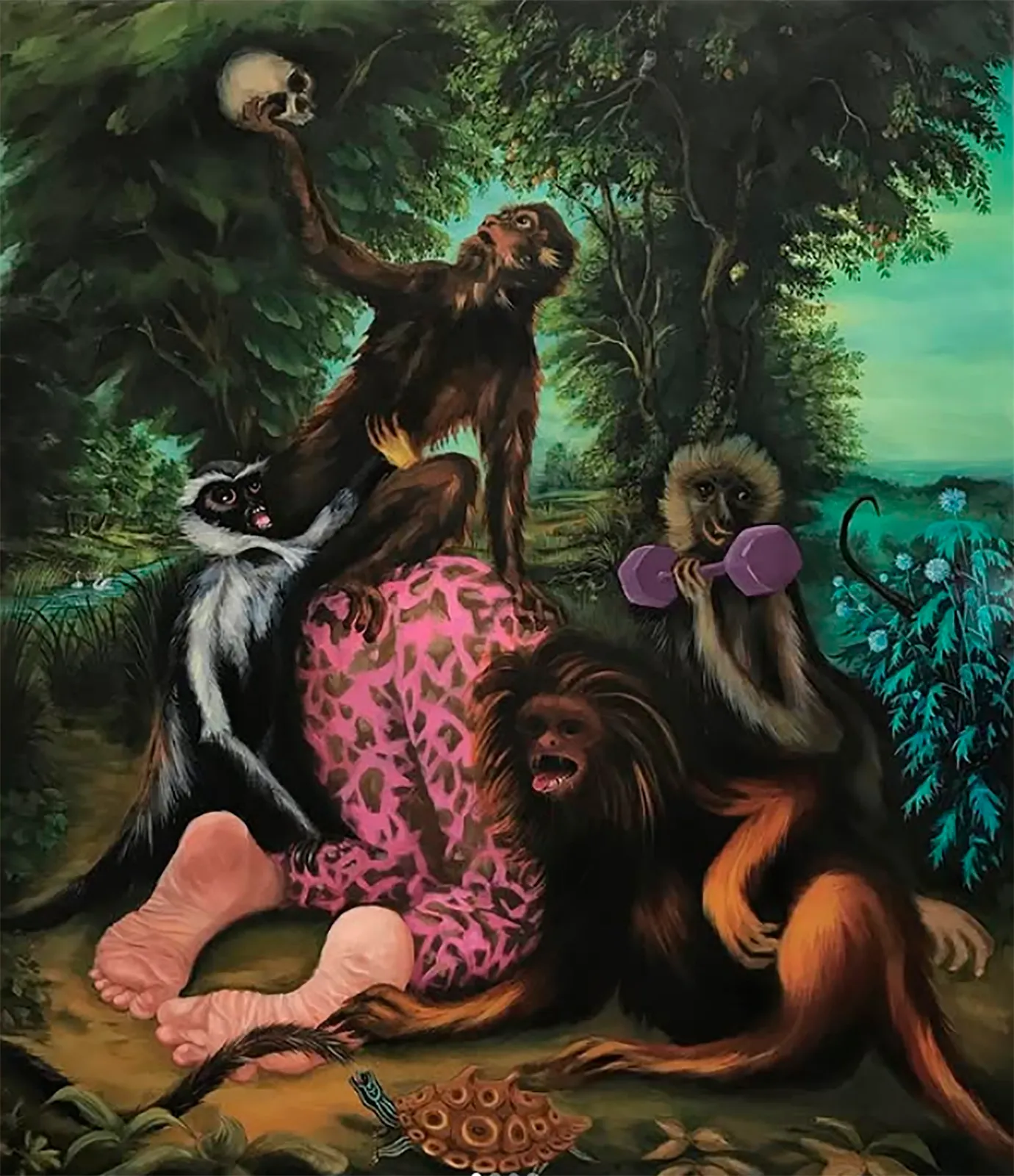 Su enfoque aquí recae en el retrato humano, la contorsión corporal, el paisaje y la animalia, muestreando con destreza y curiosidad momentos clave en los archivos histórico-artísticos de la pintura. En ellos es evidente un interés por revisitar convenciones sociales como los títulos, el vestuario y la relación del hombre con animales domésticos y raros —antes indicativos de estatus social— que enriquecen reflexiones sobre el nomadismo, el «autocuidado» y el simbolismo del memento mori, lo fantástico y lo mítico.