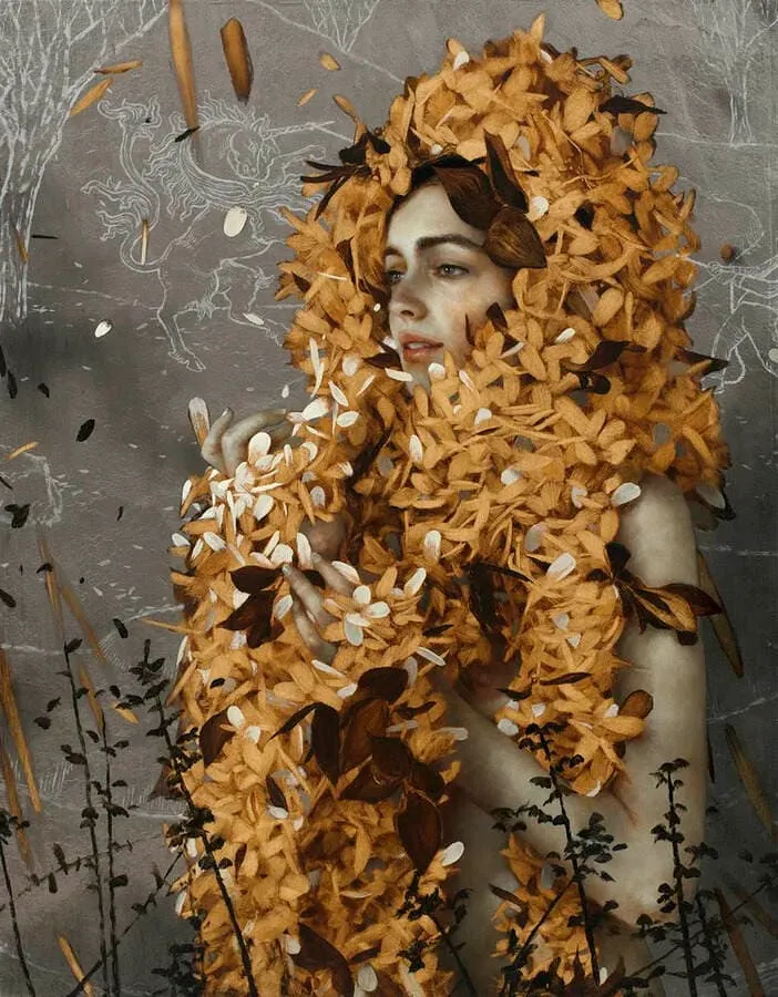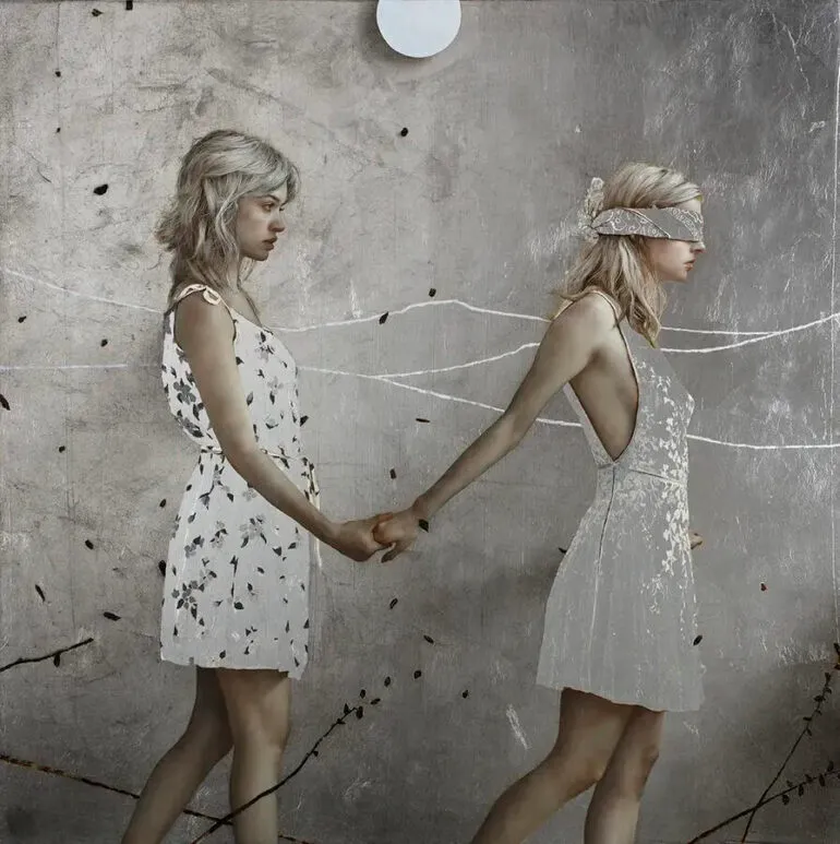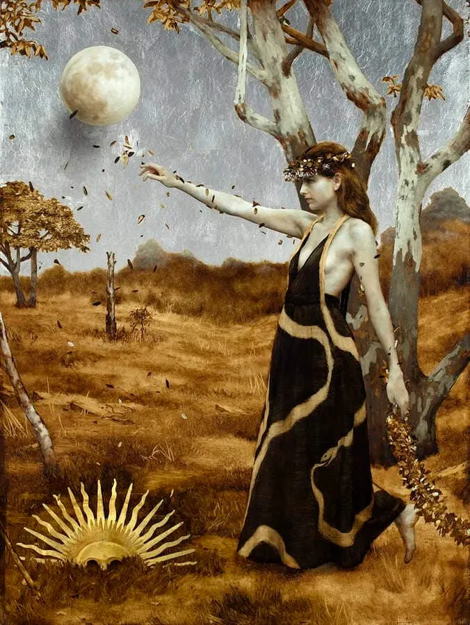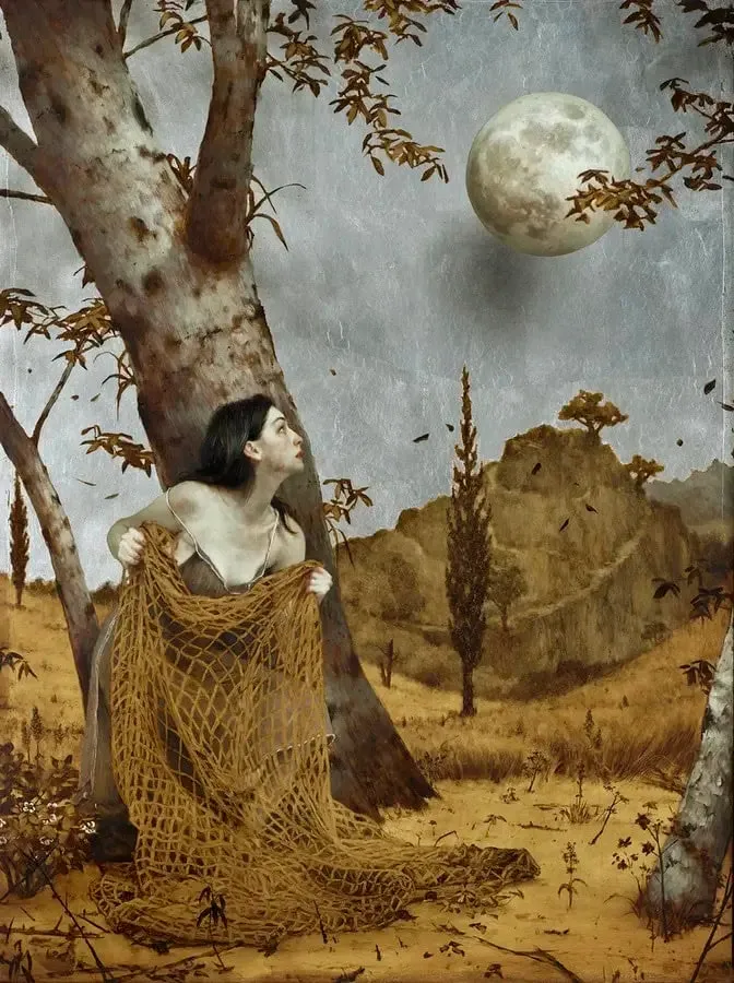 Sus mujeres parecen surgir de un sueño antiguo. No son figuras frágiles ni figuras altivas. Son presencias. A veces están quietas, como si escucharan algo que el espectador no puede oír. Otras veces parecen estar a punto de moverse, de abandonar el lienzo y caminar hacia un bosque que solo existe en la memoria. La hoja de oro y plata que utiliza no es un truco. Es un lenguaje. Un modo de decir que la luz también puede ser piel, que el brillo puede ser una forma de verdad.