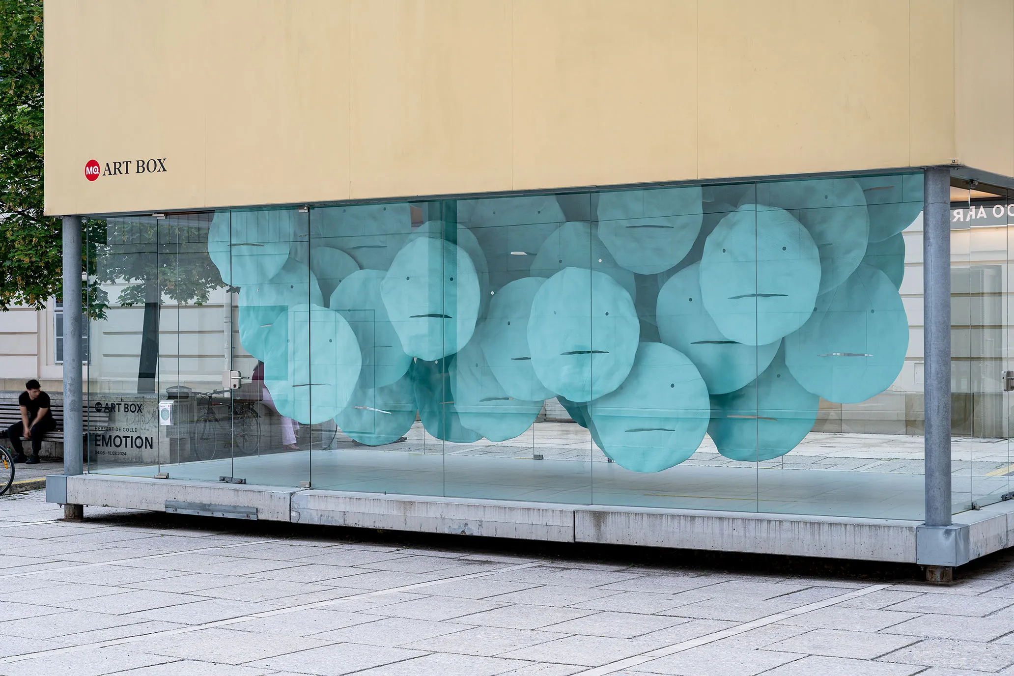 Para la MQ Art Box, Herbert De Colle ha instalado una variación específica para el espacio de su serie en curso EMOTION, iniciada en 2018. Un círculo, dos puntos a modo de ojos y una línea como boca: el smiley, diseñado en 1963 por el diseñador gráfico Harvey Hall, es uno de los símbolos más conocidos e icónicos de la cultura pop y constituye la referencia visual de esta obra.