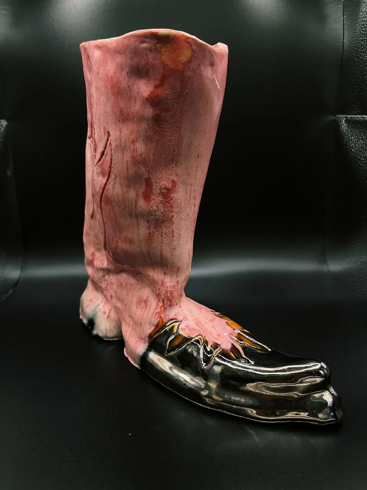 También en tres dimensiones, Patricia Paz utiliza la ironía para modelar un cuchillo con la inscripción «How to survive modern art» y reinventa sus icónicas botas cowboy, que fueron un éxito desde la primera vez que las expuso en Casa Sostoa.