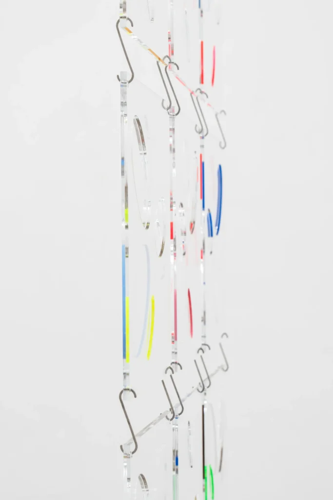 Si Ópalo ocupa el espacio principal de la galería, The Ópalo (Box) (2026) es, en cierto modo, su versión opuesta, ya que, como su título indica, se encuentra contenida dentro de una estructura similar a una caja. La pieza utiliza las mismas pantallas modulares de plexiglás que conforman la gran instalación, pero esta vez dispuestas verticalmente, una sobre otra, incluyendo un espejo en la base que incorpora automáticamente al espectador curioso dentro de la ecuación.