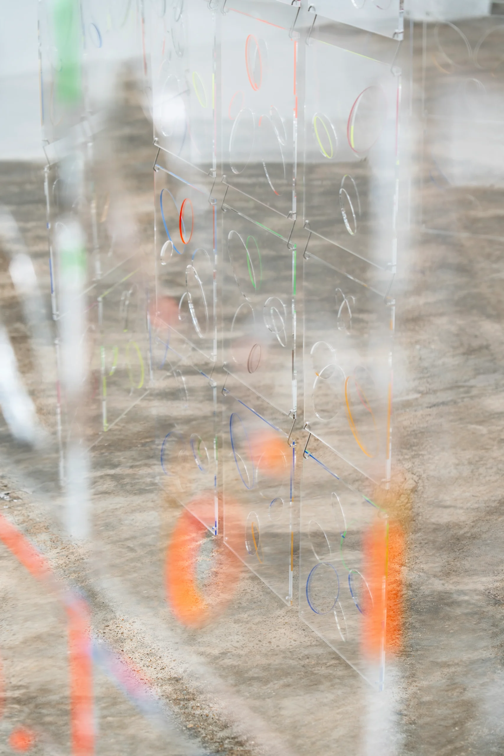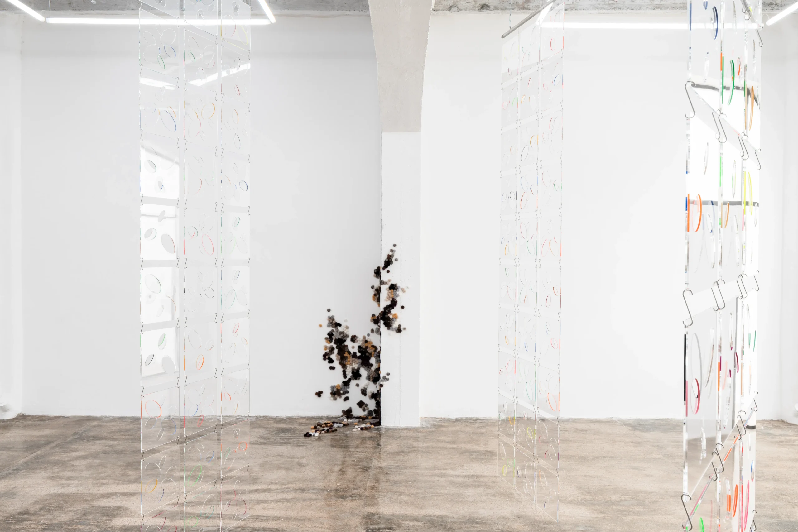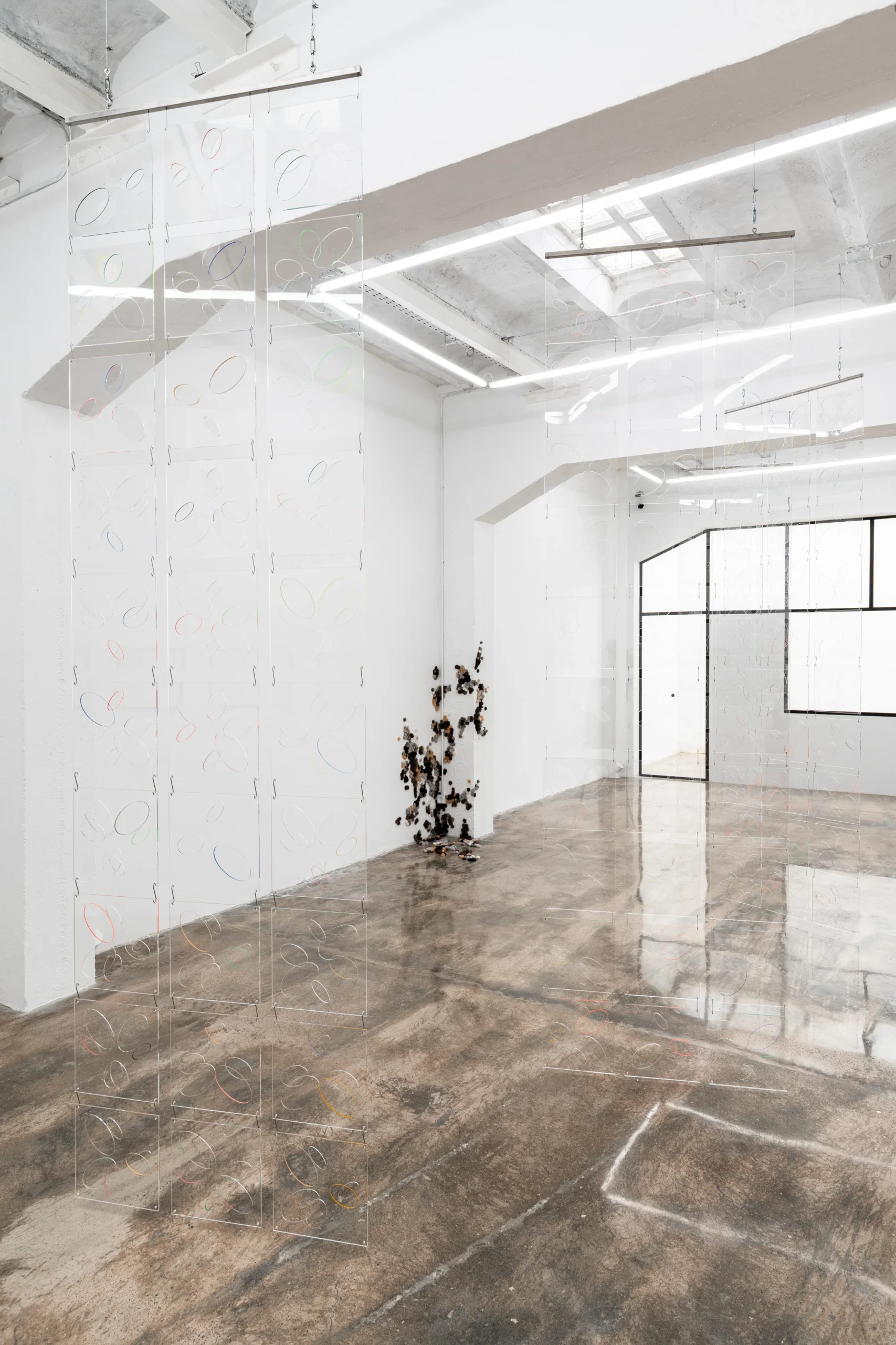 El espacio principal de la galería alberga Ópalo (2026), una serie de grandes pantallas translúcidas
