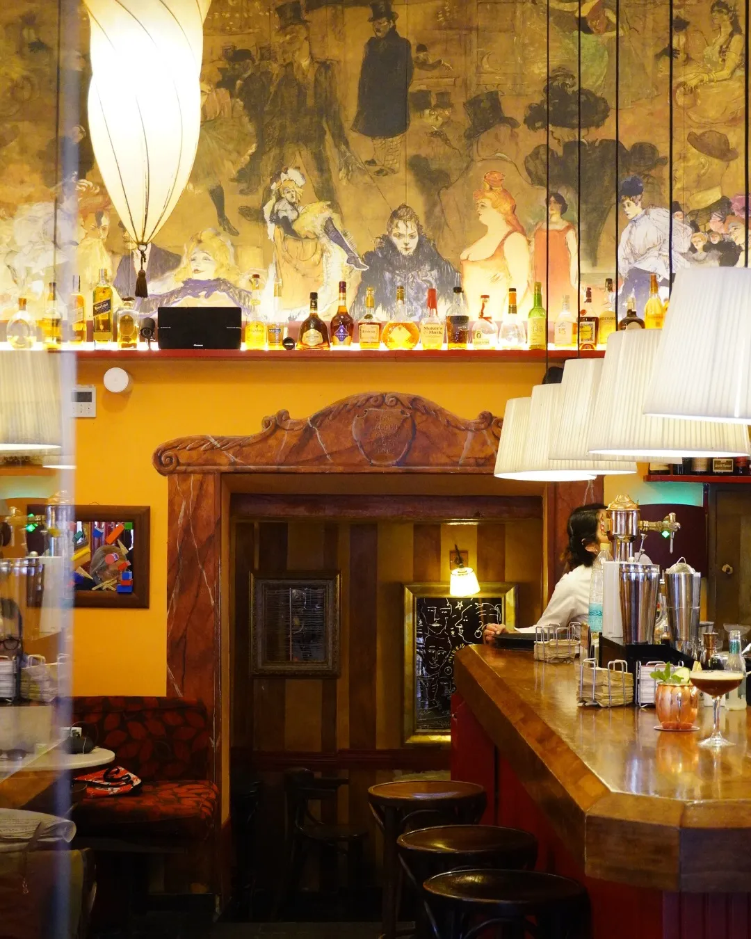 Destaca por su ambiente familiar, donde los camareros ya saben lo que quieres nada más entrar por la puerta. Su decoración clásica recuerda a un antiguo bar parisino con su mural de Touluse-Lautrec diseñado por Biel Bover. También destacan sus espejos dorados pintados por artistas locales. Especial mención a los llonguets elaborados por embutidos de La Pajarita, nuestra sobrasada ecológica Son Cànaves y el pan del Forn de la Pau.