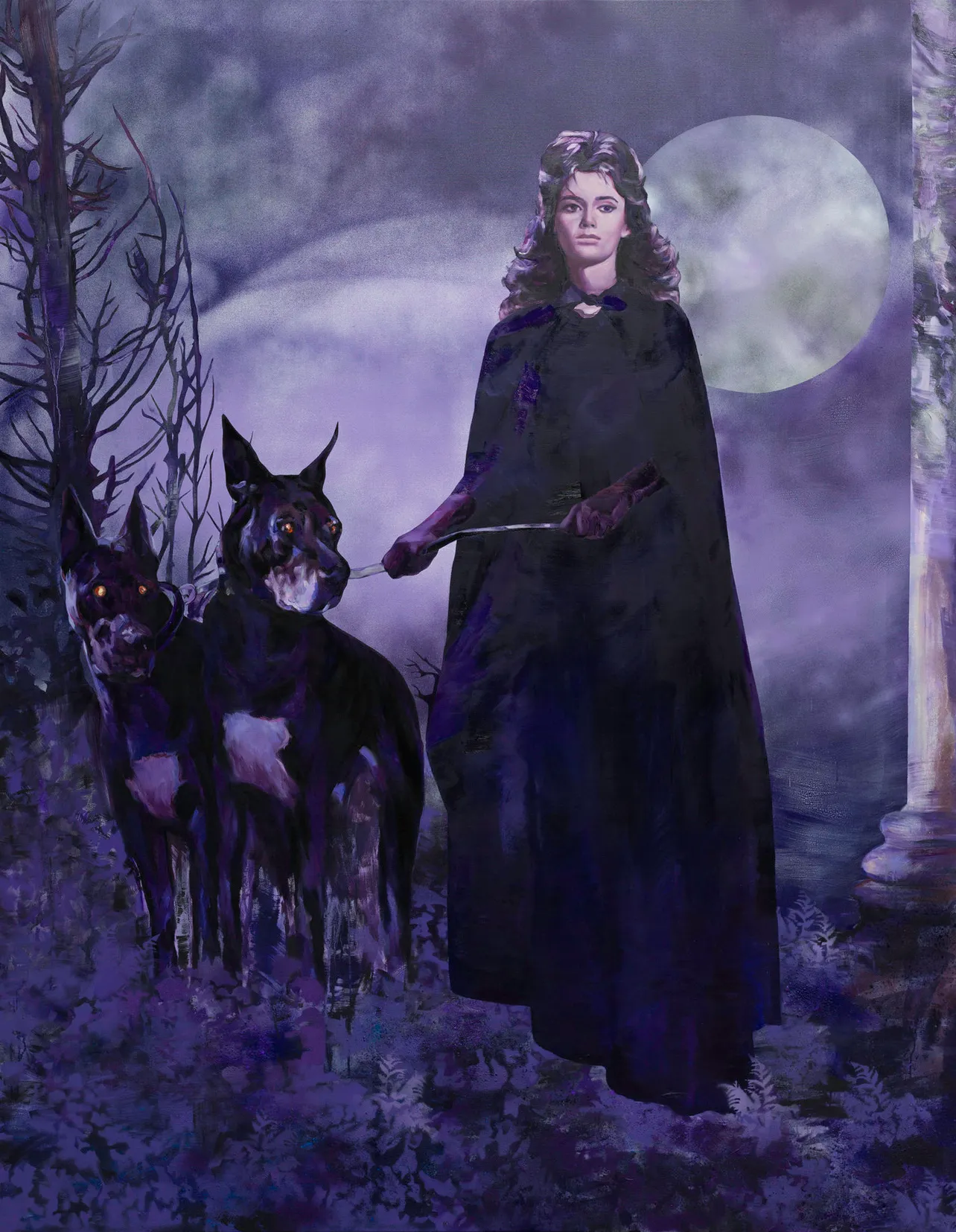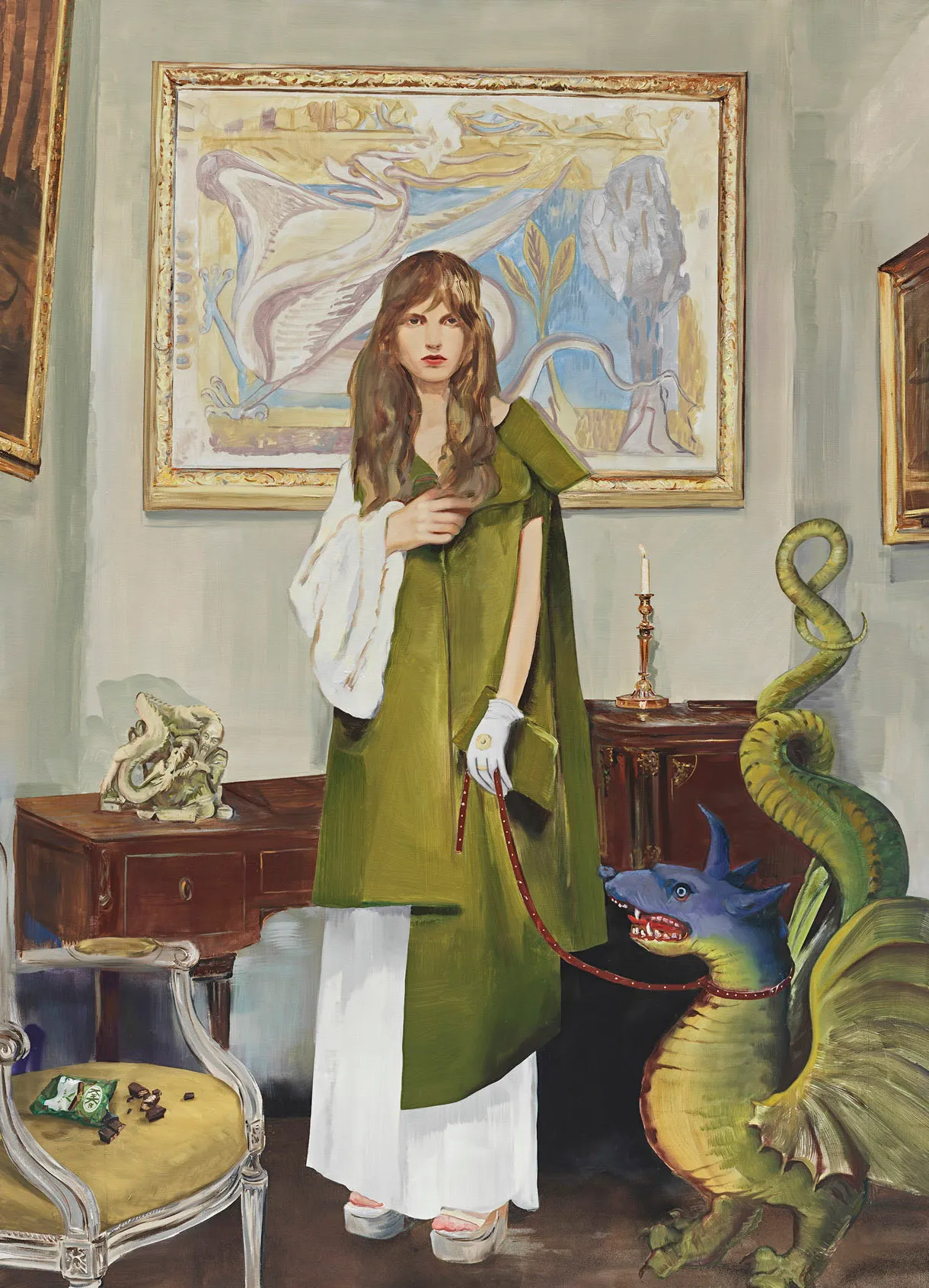 En “Wisteria, Mysteria, Hysteria”, Olowska presenta su primera serie de pinturas concebidas y realizadas íntegramente en el pequeño pueblo polaco de Rabka-Zdrój, donde vive y trabaja. Las pinturas incorporan referencias arcanas y detalles matizados procedentes de fuentes que aluden a lo pastoral.