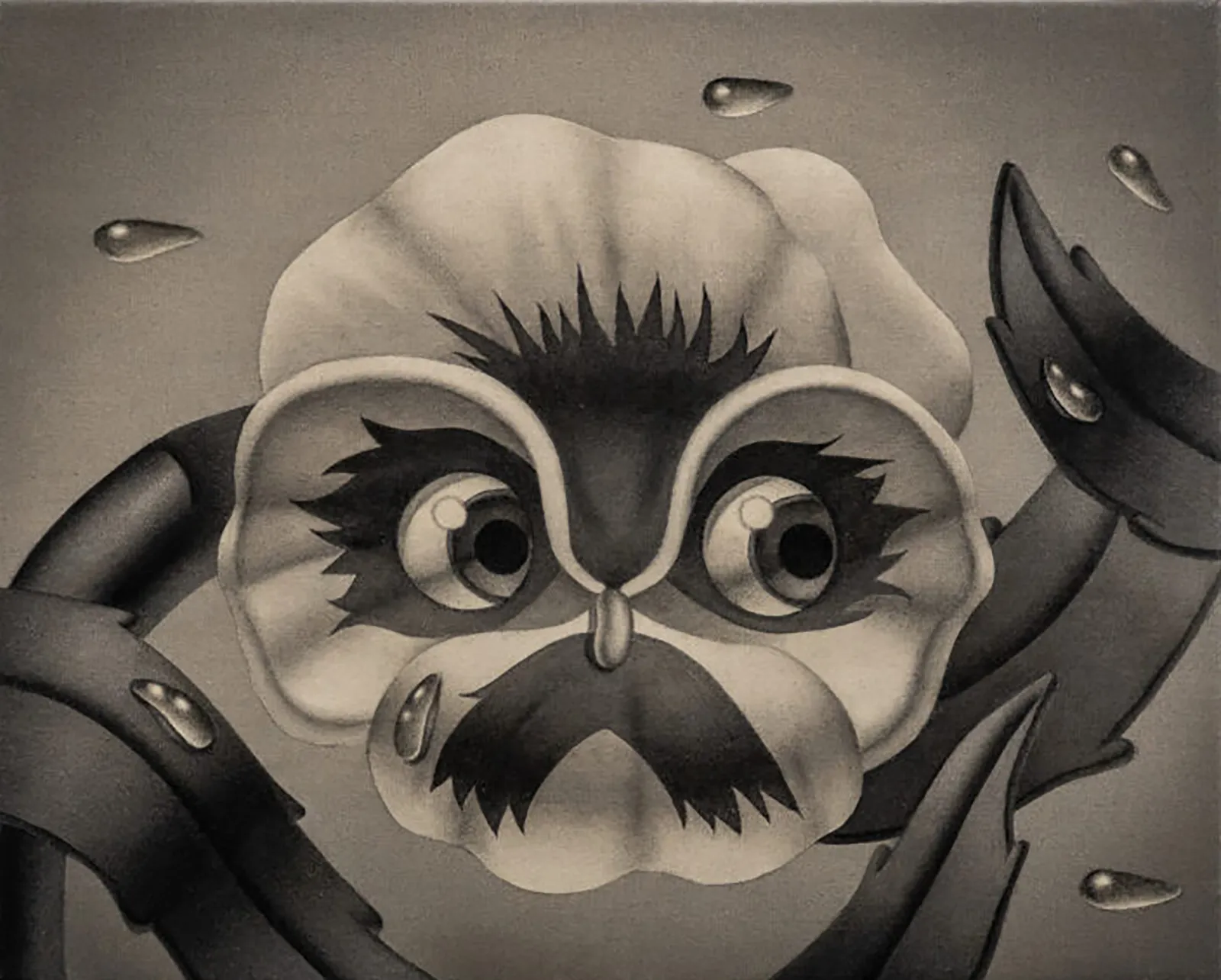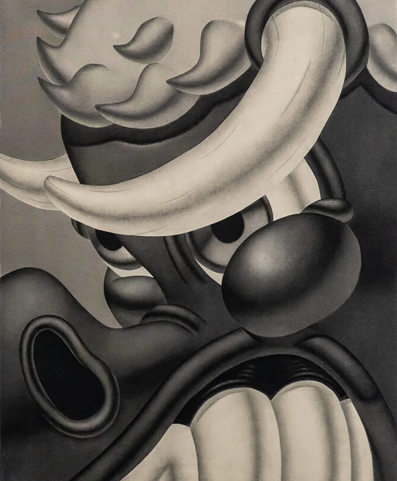 El arte de Tinoco responde a un estado avanzado de la conciencia con criaturas híbridas como avatares de una preocupación actual consistente en la titánica lucha contra lo que nos viene impuesto genéticamente: como ese toro enamorado de las flores, pero al que educan para que sea lo que el gen le tiene preparado, no su sensibilidad por lo bello, sino su brusquedad expresada en la embestida como metáfora de la situación de un mundo en la frontera entre lo real y lo imaginado. Y ahí emergen los grises como forma de expresión radical.