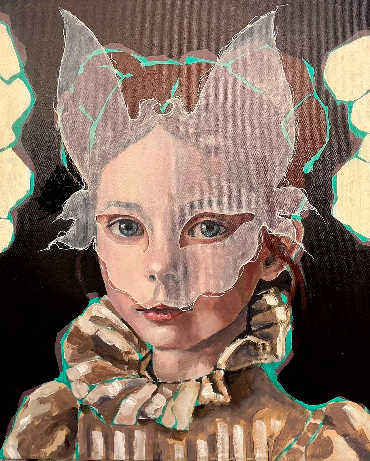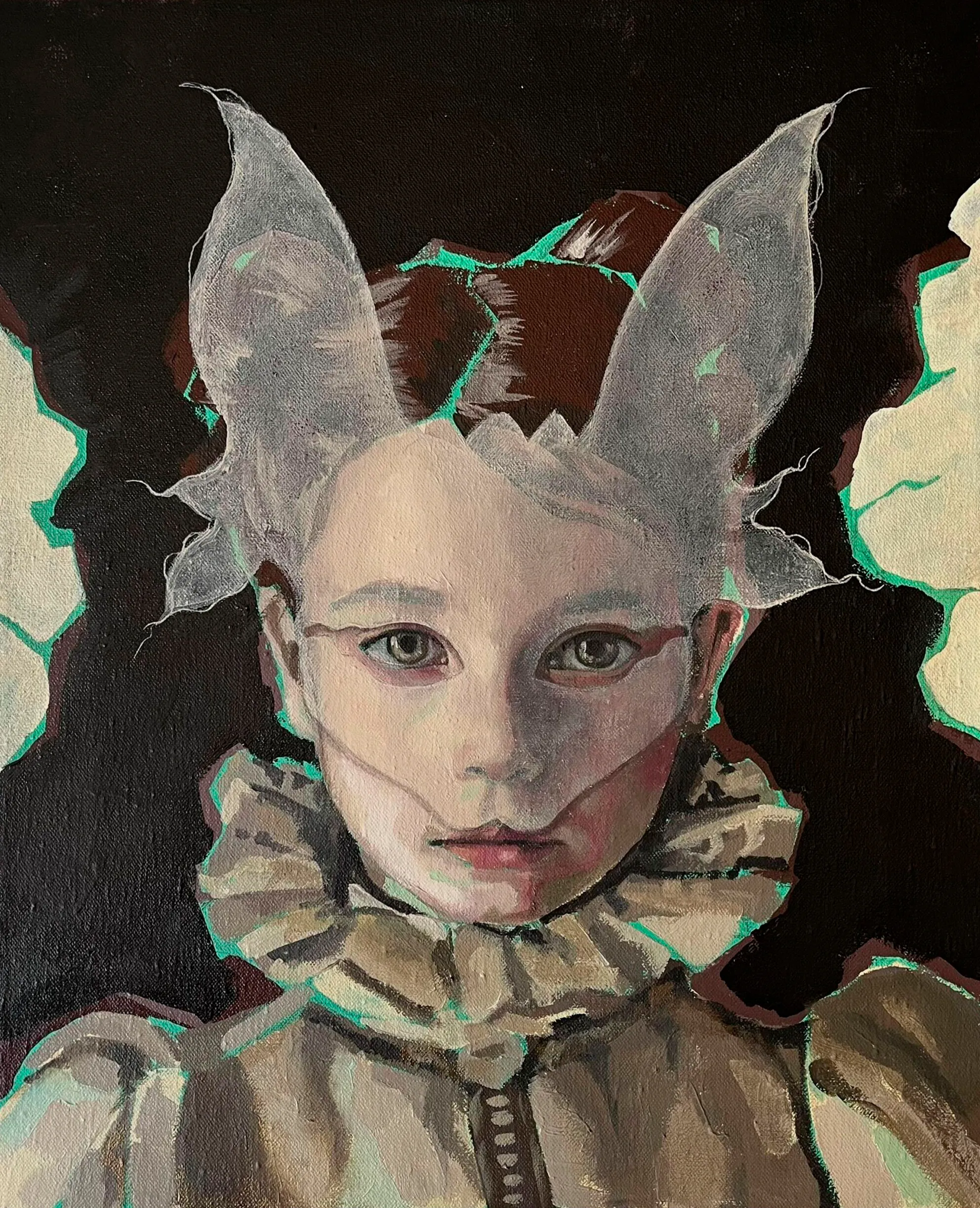 En la serie HIKIKOMORI la artista se parara a pensar en algo que ha observado mucho hoy en día, cómo los jóvenes se encierran en su propio mundo. El nombre hikikomori viene de ese fenómeno donde la gente decide aislarse por completo en casa. En el cuadro, esa “casita” que rodea la cabeza es una metáfora de ese refugio que te construyes para sentirte a salvo, pero que a la vez te separa de los demás.