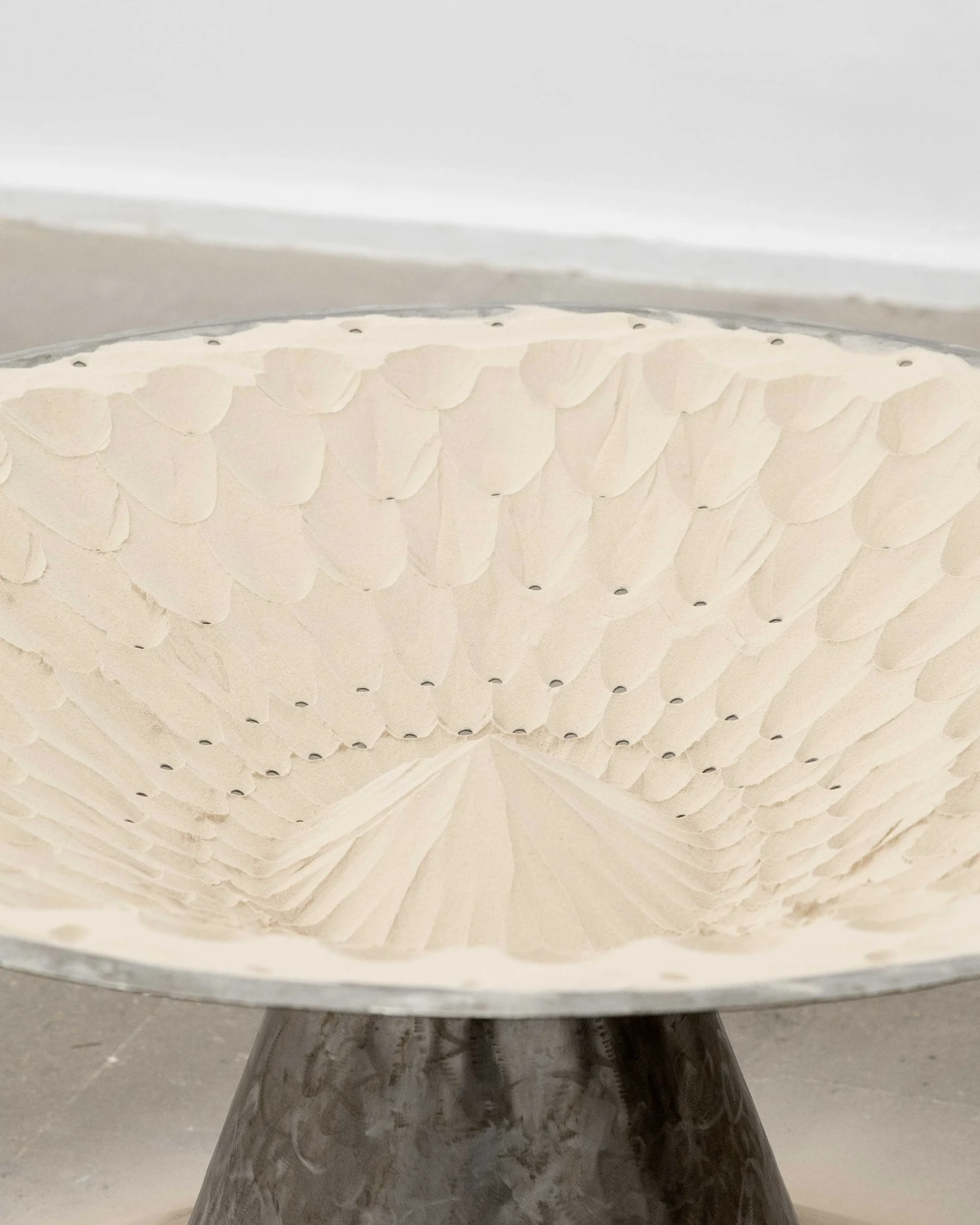 El mercurio, la arena, el agua, el cobre, el latón, el plomo o el wolframio, la piedra, el mármol, la madera, el corcho y el caucho o polímeros como el vinilo, el plástico, el dibond, la parafina y la cera configuran en sus obras mapas, topografías, constelaciones que conectan, con sus sinergias y metamorfosis, cruces y puentes entre el lenguaje y la arquitectura, el feminismo, la ecología, la etnografía y ciencias como la ornitología, la minería, la metalurgia o la hidrografía.