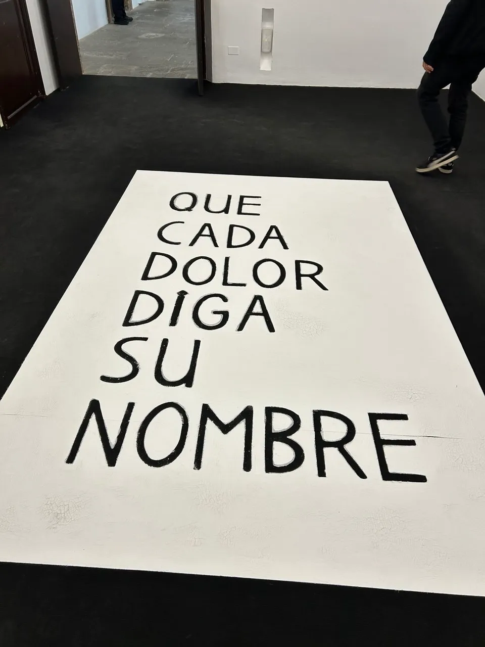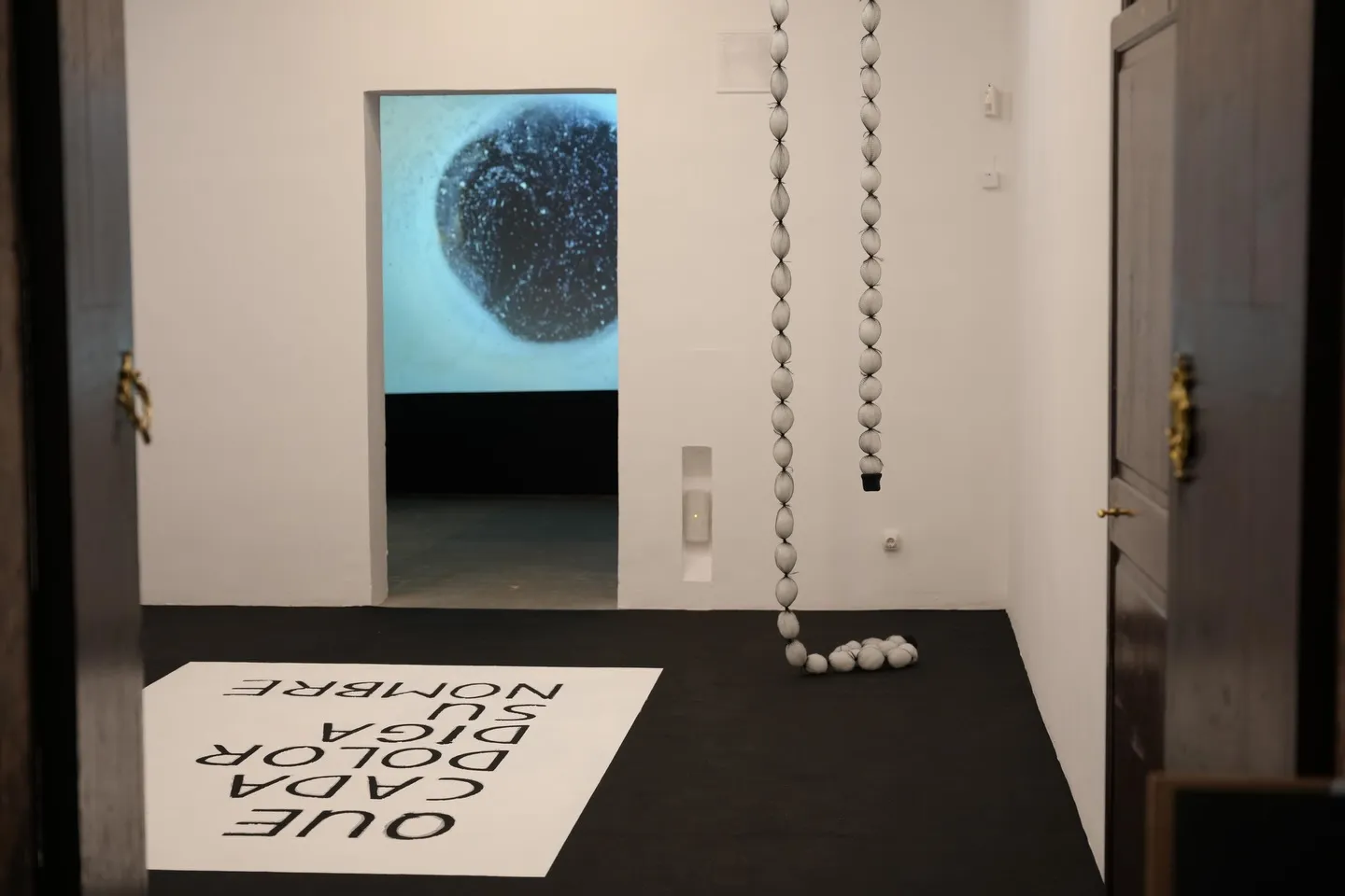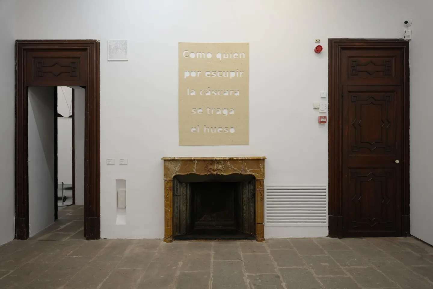 Voces que hablan lenguas ininteligibles en peligro de extinción, susurros desconocidos y ocultos, trinos de pájaros, manos que anudan y enlazan figuras idiomáticas con juegos de cuerdas, palabras hendidas en superficies de cal que convocan a los dolores a decir su nombre, actos fallidos y citas ya lejanas que nos inducen a mirar un mundo que desaparece, lenguas de lacre, estaño, lana y fieltro y una lengua de cal que, extendiéndose en la superficie, se agrieta e invade lo transitable.
